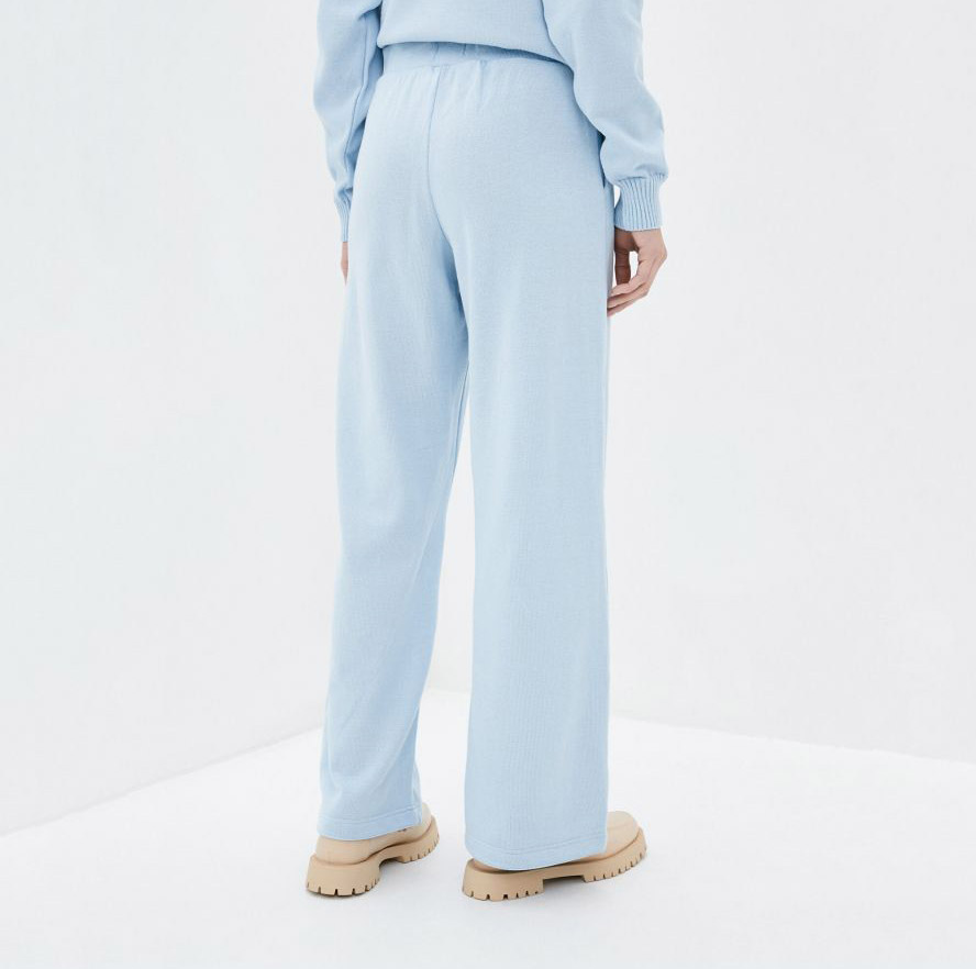 Стильні однотонні штани блакитного кольору. Модель машинної в'язки, вільного крою, з бічними кишенями. Штани зручні та практичні, добре виглядають на будь-якій фігурі. Штани виконані з м'якого якісного матеріалу на основі бавовни та акрилу.
