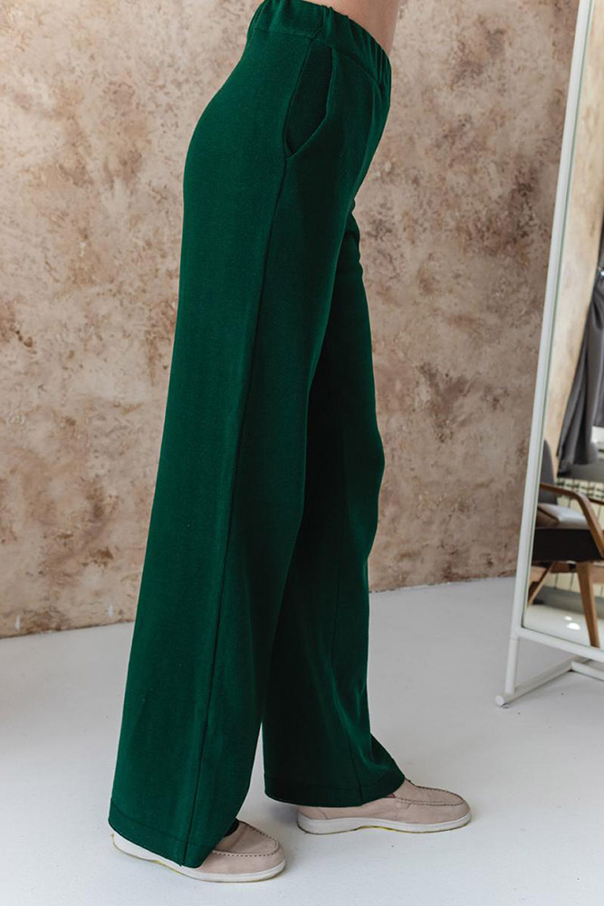 Однотонні стильні штани зеленого кольору. Модель машинної в'язки, вільного крою, з бічними кишенями. Штани зручні та практичні, добре виглядають на будь-якій фігурі. Штани виконані з м'якого якісного матеріалу на основі бавовни та акрилу.