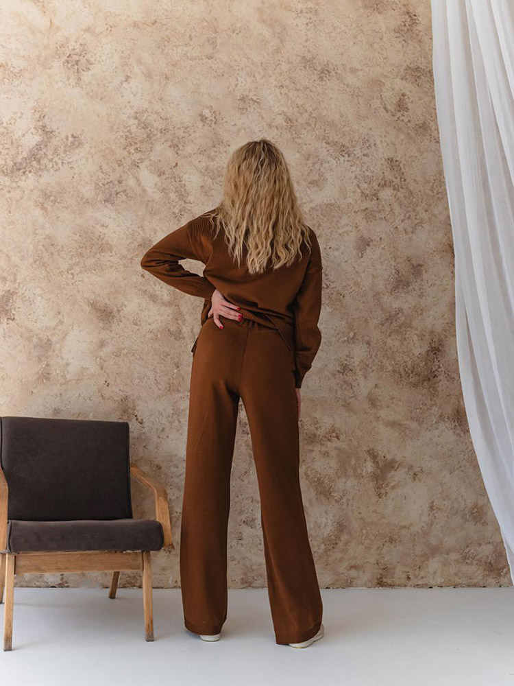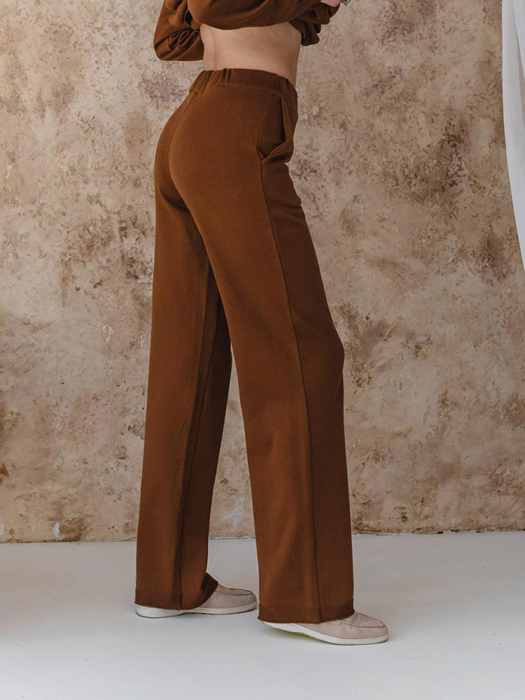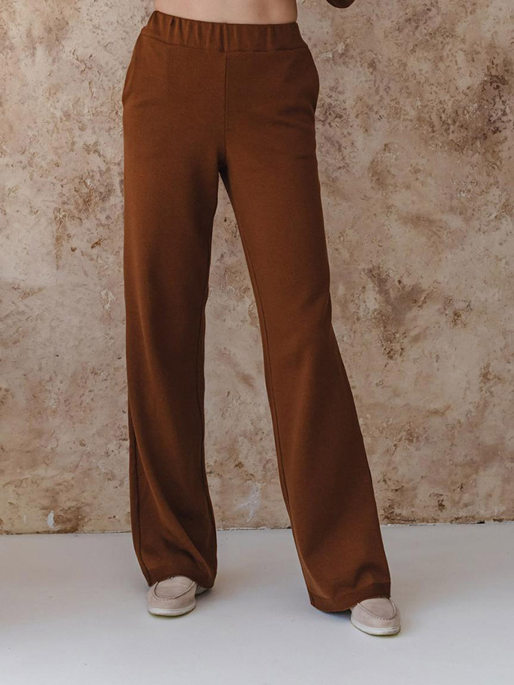 Однотонні стильні штани коричневого кольору. Модель машинної в'язки, вільного крою, з бічними кишенями. Штани зручні та практичні, добре виглядають на будь-якій фігурі. Штани виконані з м'якого якісного матеріалу на основі бавовни та акрилу.