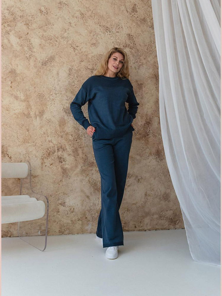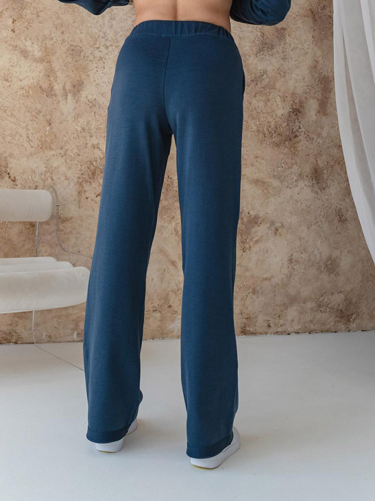 Однотонні стильні штани синього кольору. Модель машинної в'язки, вільного крою, з бічними кишенями. Штани зручні та практичні, добре виглядають на будь-якій фігурі. Штани виконані з м'якого якісного матеріалу на основі бавовни та акрилу.