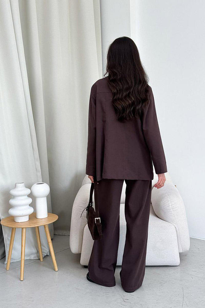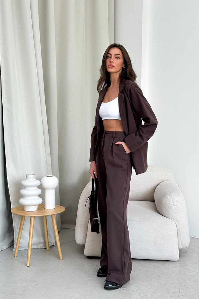 Стильні жіночі штани-палаццо шоколадного кольору. Модель з високою посадкою і з двома боковими кишенями, застібається на блискавку і ґудзик. Ззаду на поясі - гумка для більш комфортної посадки.