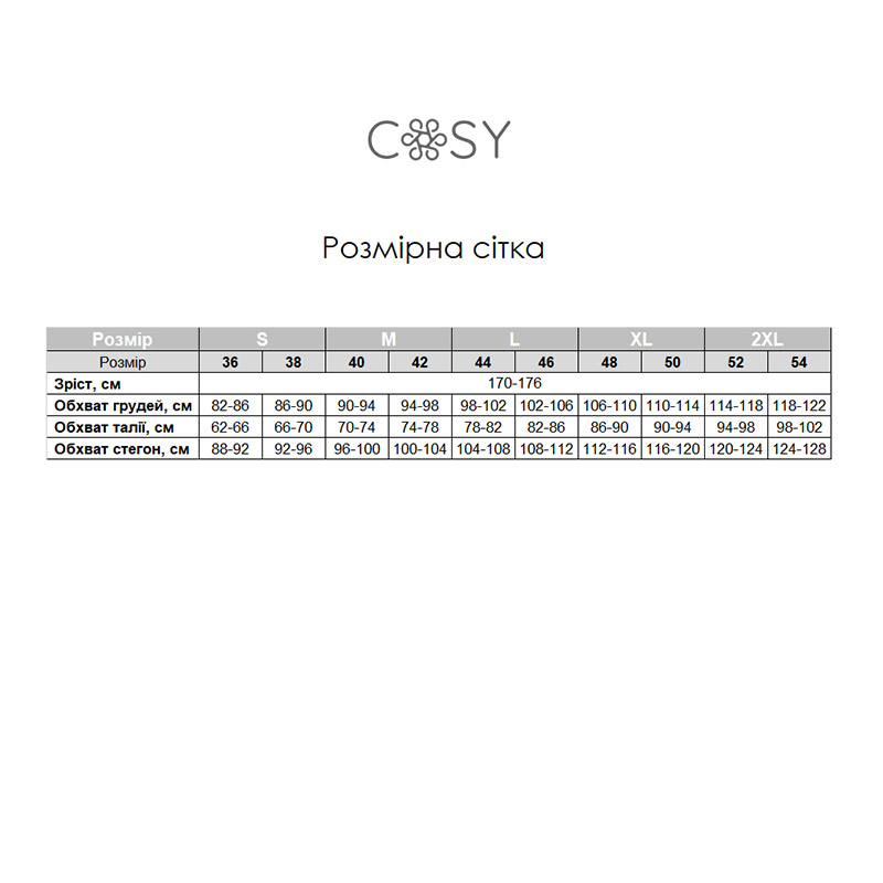 COSY - український бренд одягу та текстилю для дому. Велика увага приділяється якості виготовлення кожної моделі. М'які натуральні тканини, сучасний лаконічний крій, старанність у деталях - усе це сприяє зручності та відчуттю затишку. COSY хоче привнести в повсякденне життя людей більше краси та комфорту. Ці товари для тих, хто любить свою сім'ю, своїх близьких, свій дім. COSY - затишок і комфорт щодня!