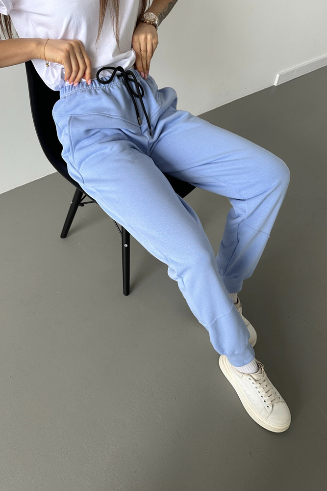 Жіночі спортивні штани блакитного кольору з кокеткою, поєднання комфорту, стилю й універсальності. Вільний крій дає змогу вільно рухатися і підходить для будь-якого типу фігури, створюючи комфортний і розслаблений силует. Цей фасон ідеально підходить для активних занять, прогулянок або повсякденного носіння вдома. Трикотажна тканина м'яка, приємна на дотик, дарує відчуття затишку і комфорту.