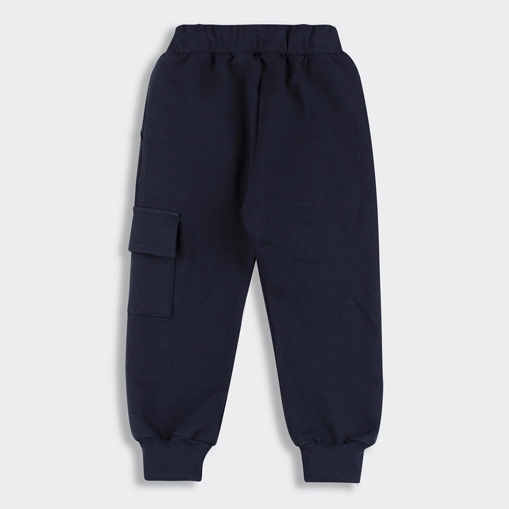 Трикотажні спортивні штани темно-синього кольору. Штани виконані з тканини трикотаж-двонитка, що складається з бавовни та поліестеру. Матеріал забезпечує комфорт і м'якість під час носіння, практичність і довговічність. Штани однотонні, пояс на широкій зручній гумці, є бічні прорізні кишеньки і велика кишеня з клапаном і нашивкою.