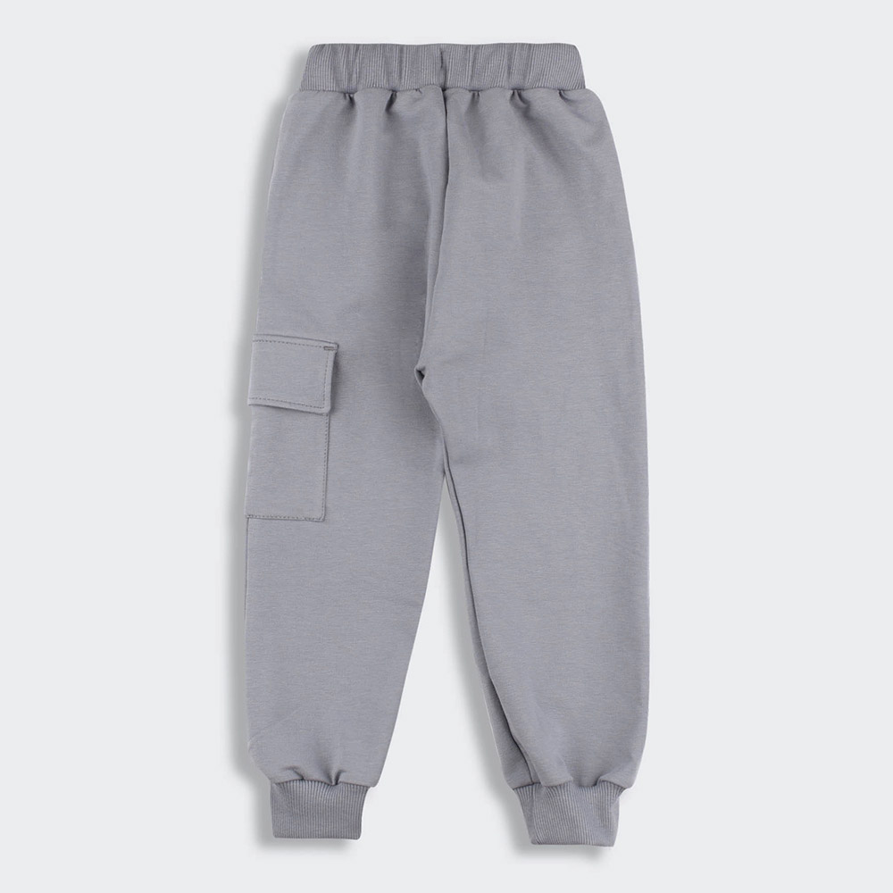 Трикотажні спортивні штани сірого кольору. Штани виконані з тканини трикотаж-двунитка, що складається з бавовни та поліестеру. Матеріал забезпечує комфорт і м'якість під час носіння, практичність і довговічність. Штани однотонні, пояс на широкій зручній гумці, є бічні прорізні кишеньки і велика кишеня з клапаном і нашивкою.