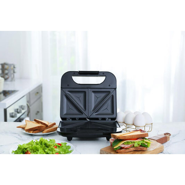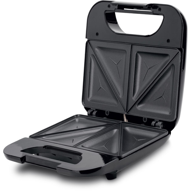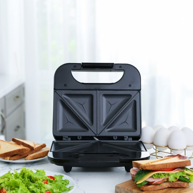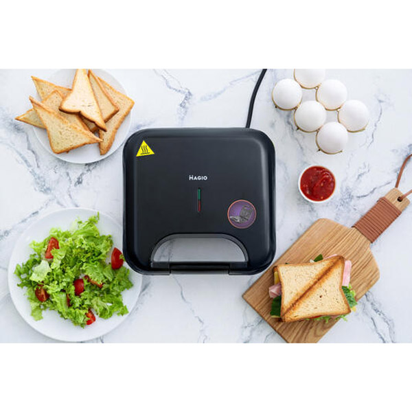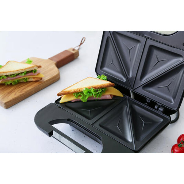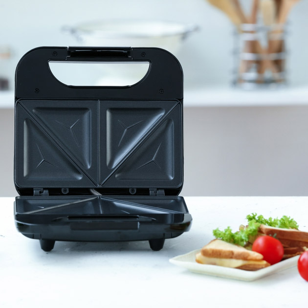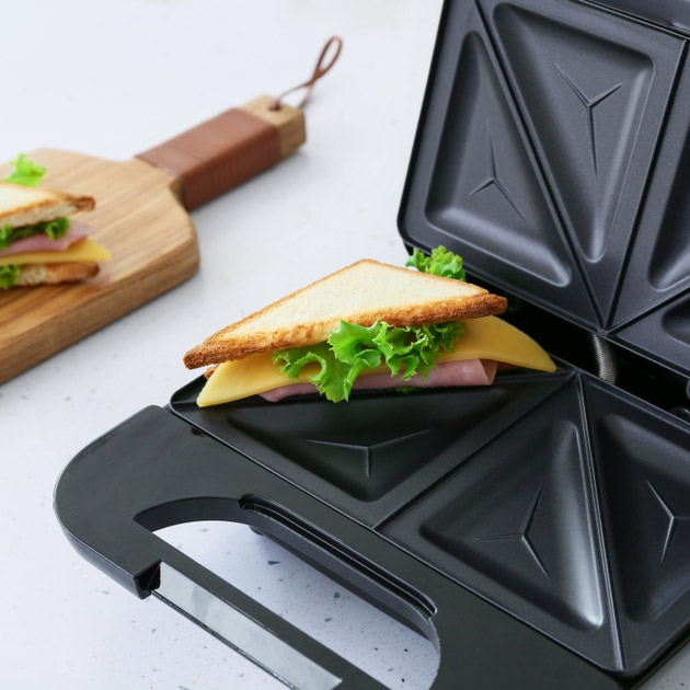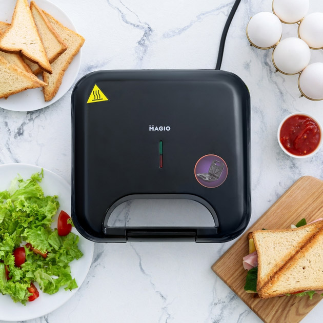 Сендвічниця від Magio дозволяє швидко приготувати смачні та поживні сендвічі. Одночасно можна випікати 4 бутерброди, краї яких щільно запаюються, утримуючи начинку всередині. Корпус виконаний із міцного термостійкого пластику, а листи з антипригарним покриттям гарантують рівномірне підсмажування. Потужність 720Вт забезпечує швидке нагрівання двох робочих поверхонь. Прилад зручний у використанні: сендвічі не пригорають та легко виймаються.