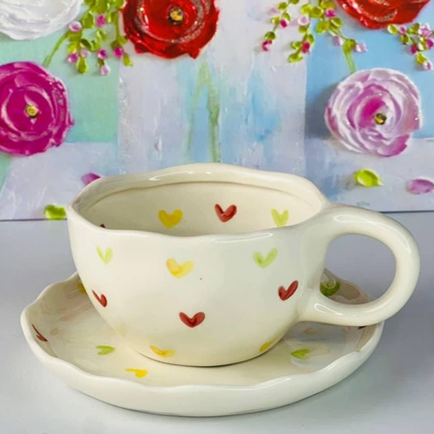 Стильна керамічна чашка із блюдцем об'ємом 300 мл із яскравим малюнком у вигляді різнокольорових сердець стане ефектним акцентом на вашому столі. Великий обсяг робить її універсальною для чаю, кави та інших гарячих напоїв. Виріб виконаний із міцної кераміки — воно довго служить і легко очищується. Веселий дизайн додає позитивну нотку у повсякденне сервірування.