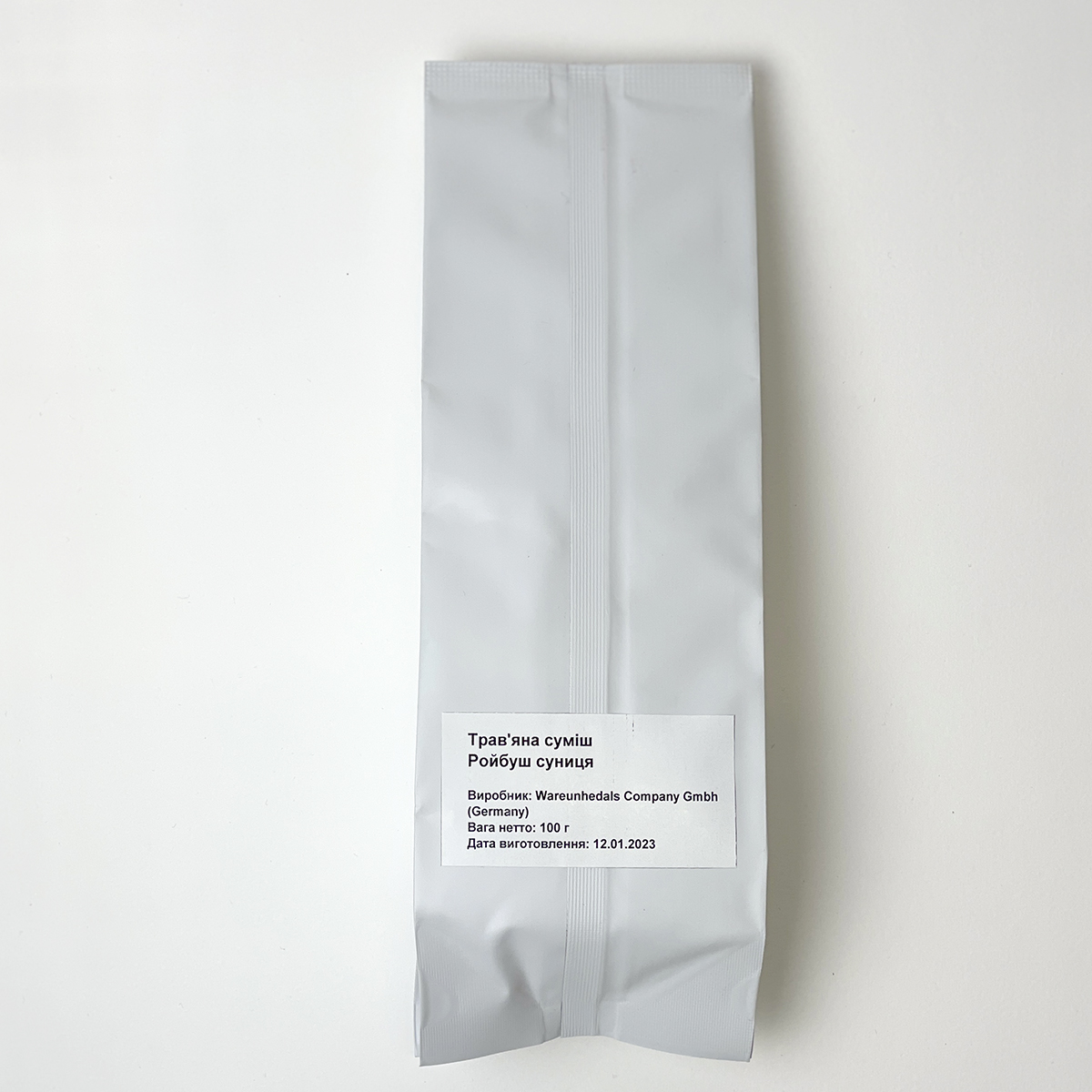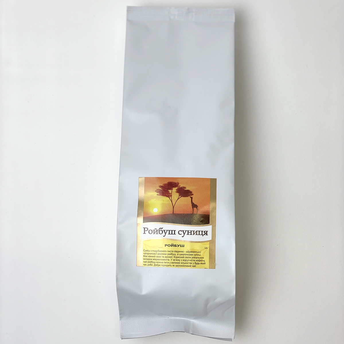 Чай трав'яний Ройбуш суниця 100 г - особливо смачна суміш, в основі якої листочки південноафриканської рослини Ройбуш і суниці. Ароматизований південноафриканський чай ройбуш зі шматочками та листям суниці. Не містить кофеїну. Корисний своїм унікальним складом мікроелементів. Має приємний м'який аромат. Це чудовий тонізувальний засіб.