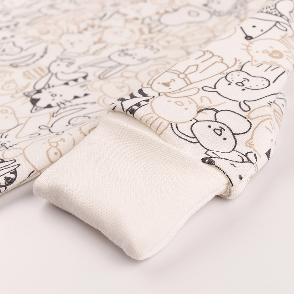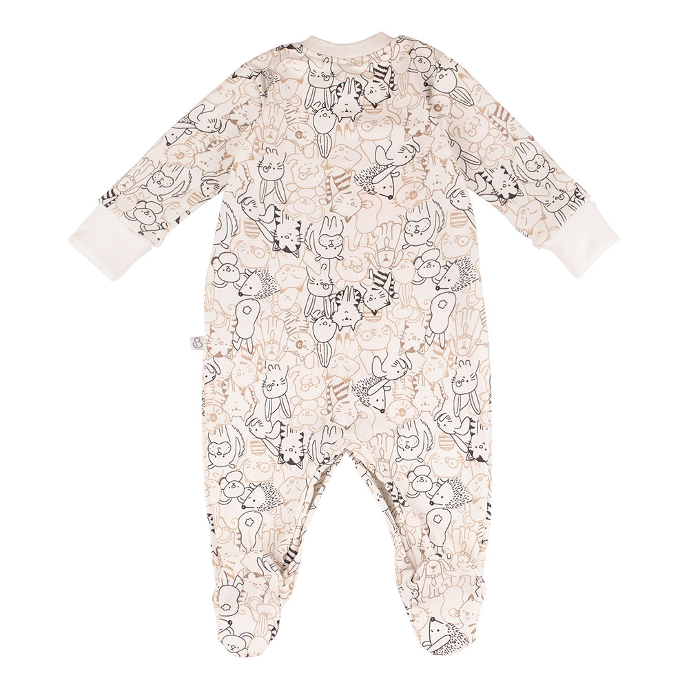 Комбінезон-чоловічок молочного кольору із симпатичним дитячим принтом. Модель універсальна, підійде і для хлопчика, і для дівчинки. Комбінезон виконаний з тканини інтерлок, що складається з 100% натуральної бавовни. Виріб забезпечує максимальну м'якість і комфорт для ніжної дитячої шкіри. Комбінезон застібається по всій довжині на кнопки, що робить його надягання та знімання максимально простим, а також дає змогу швидко та легко міняти підгузки.