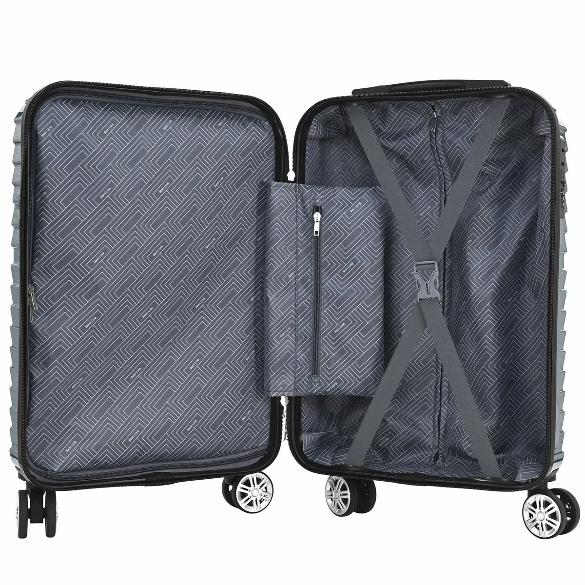 Валіза виділяється стильним кольором блакитний металік та міцним корпусом з ABS-пластику та полікарбонату. Оснащений "утопленим" кодовим замком, легкими спареними колесами та алюмінієвою телескопічною ручкою з трьома рівнями фіксації. Усередині – м'яка підкладка та кишеня на блискавці для дрібниць. Підходить під вимоги ручної поклажі більшості авіакомпаній.