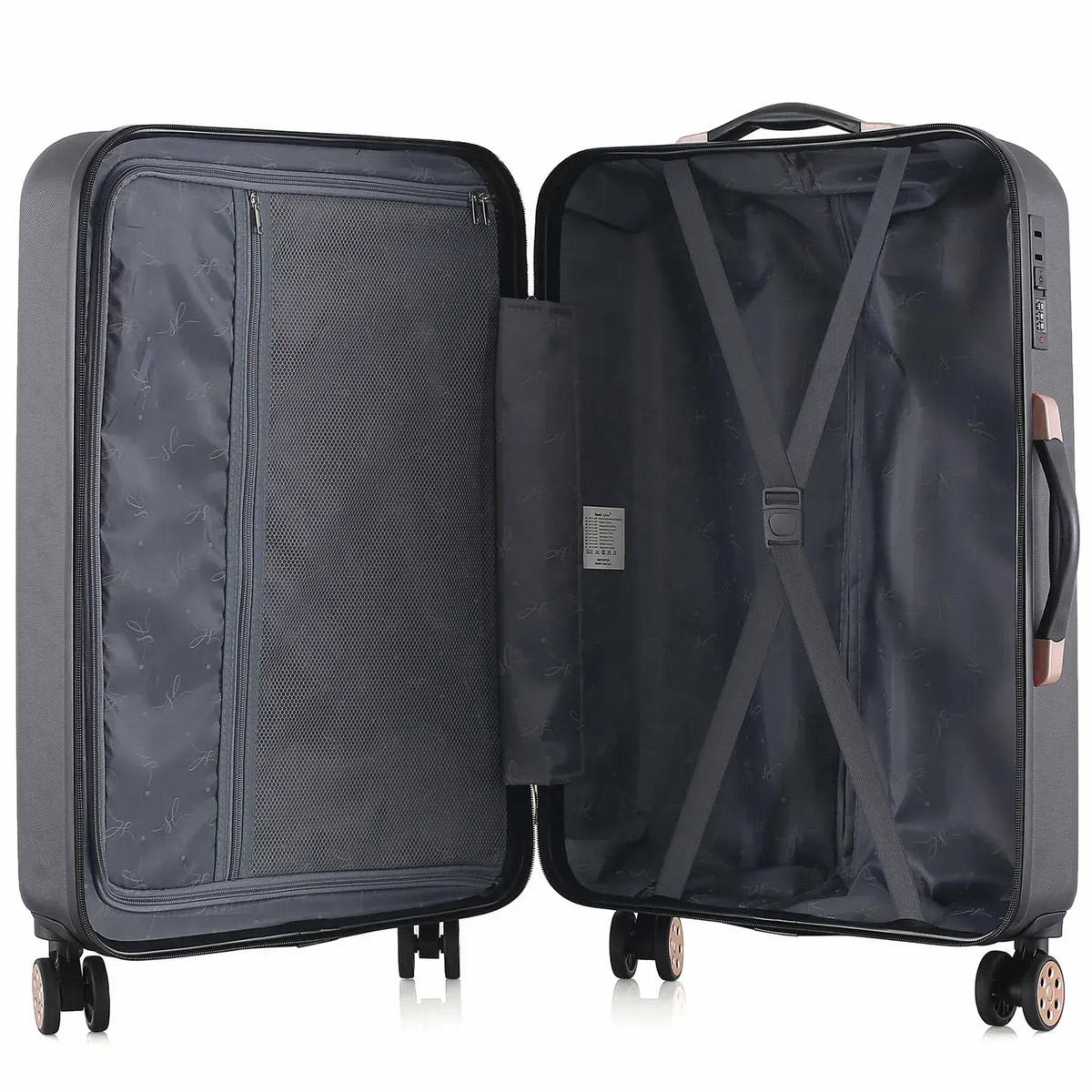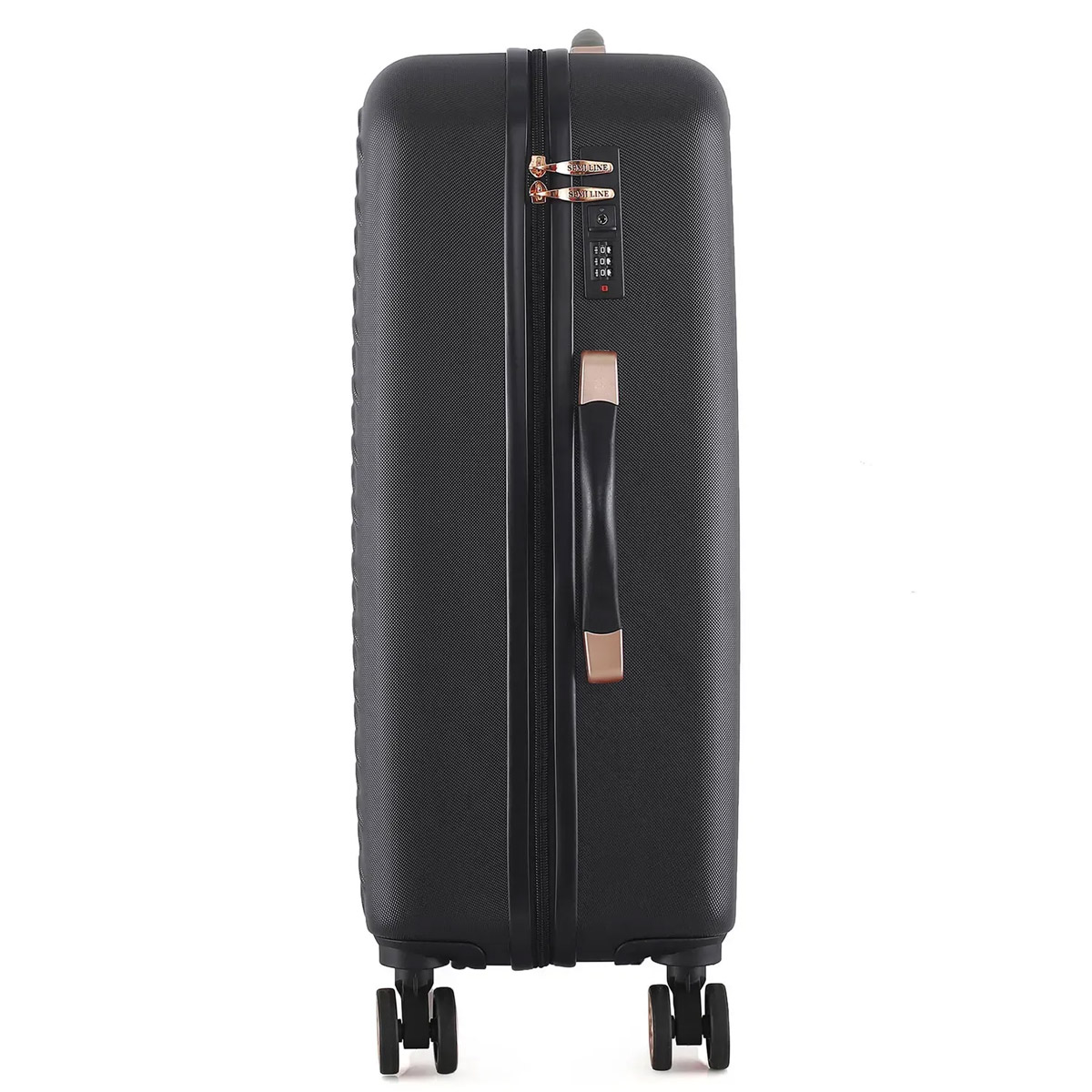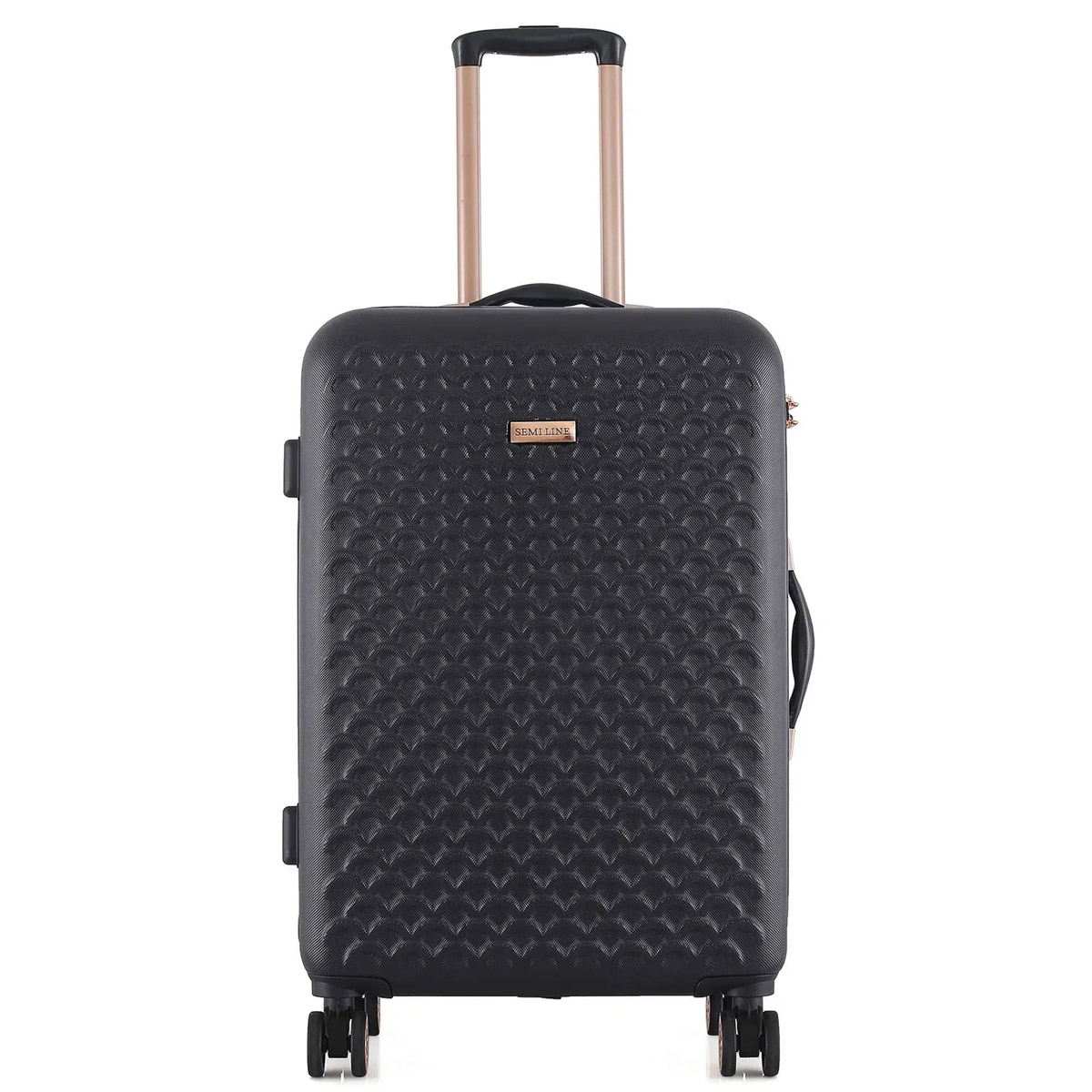 Чорна валіза від Semi Line з хвилястим візерунком фасаду та вставками під золото виглядає елегантно та стильно. Він оснащений легкою алюмінієвою телескопічною ручкою, що фіксується у трьох положеннях. Ручки для перенесення виконані з приємного на дотик пластику Soft-Touch. "Втоплений" кодовий замок не виступає над поверхнею корпусу, що робить його менш уразливим при транспортуванні та надійно захищає вміст валізи.