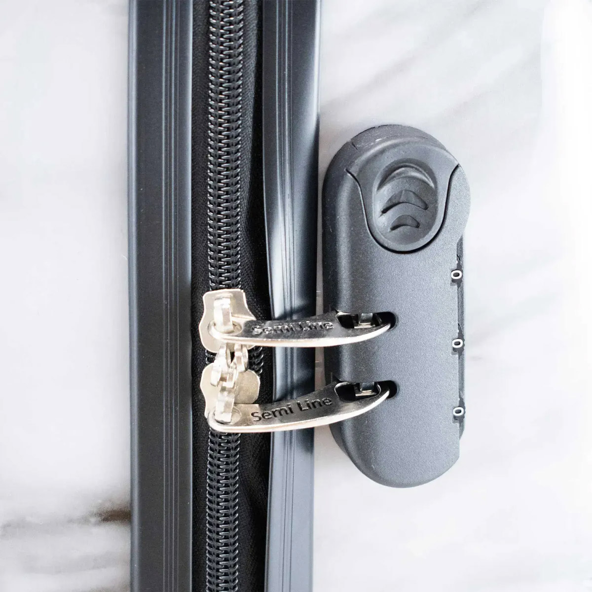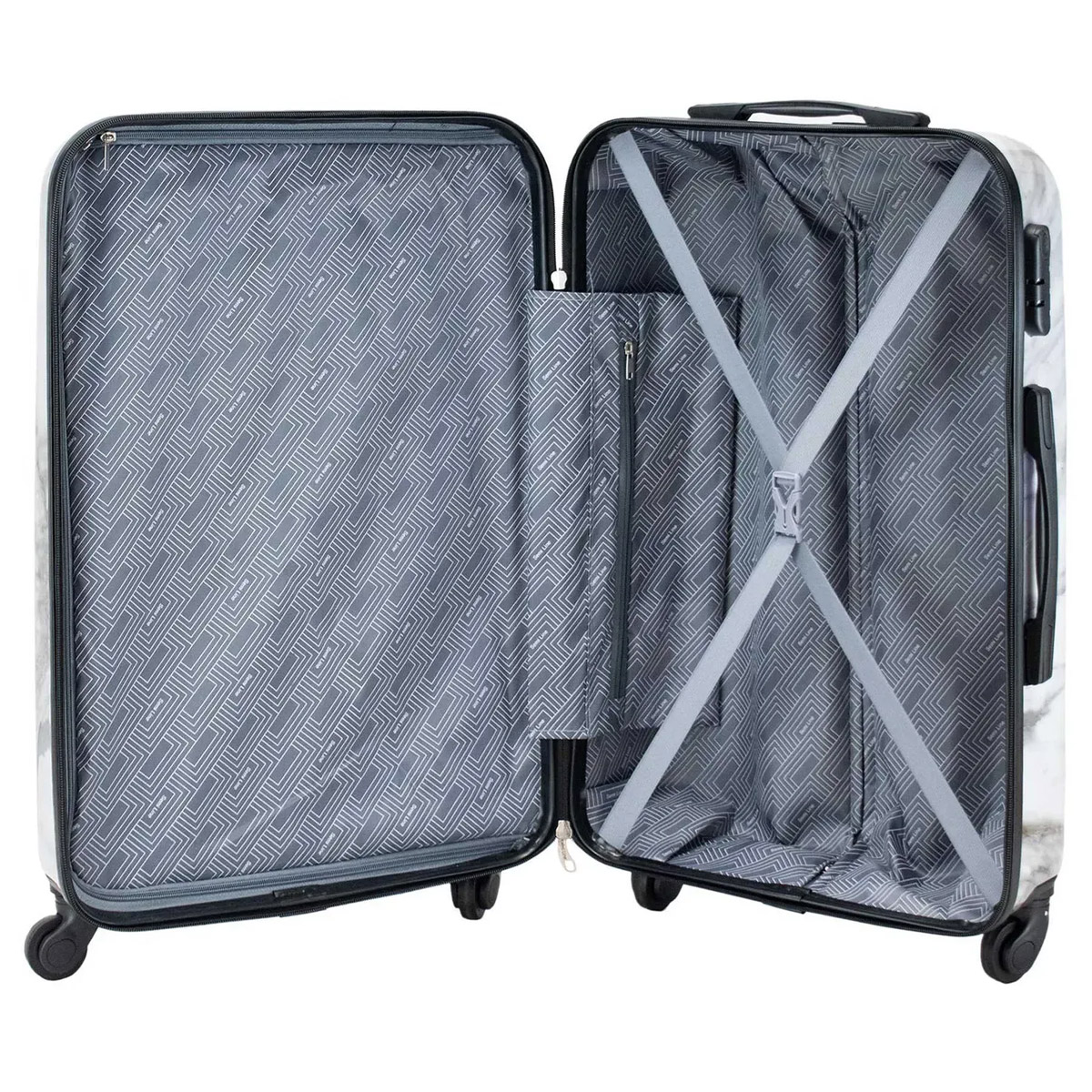 Валіза виділяється глянцевим корпусом з реалістичним мармуровим принтом. Виготовлений із міцного композиту ABS та полікарбонату. Оснащений кодовим замком, спареними поворотними колесами та легкою телескопічною ручкою з фіксатором. Усередині - м'яка підкладка, кишеня на блискавці та гелеві ручки для зручного перенесення.
