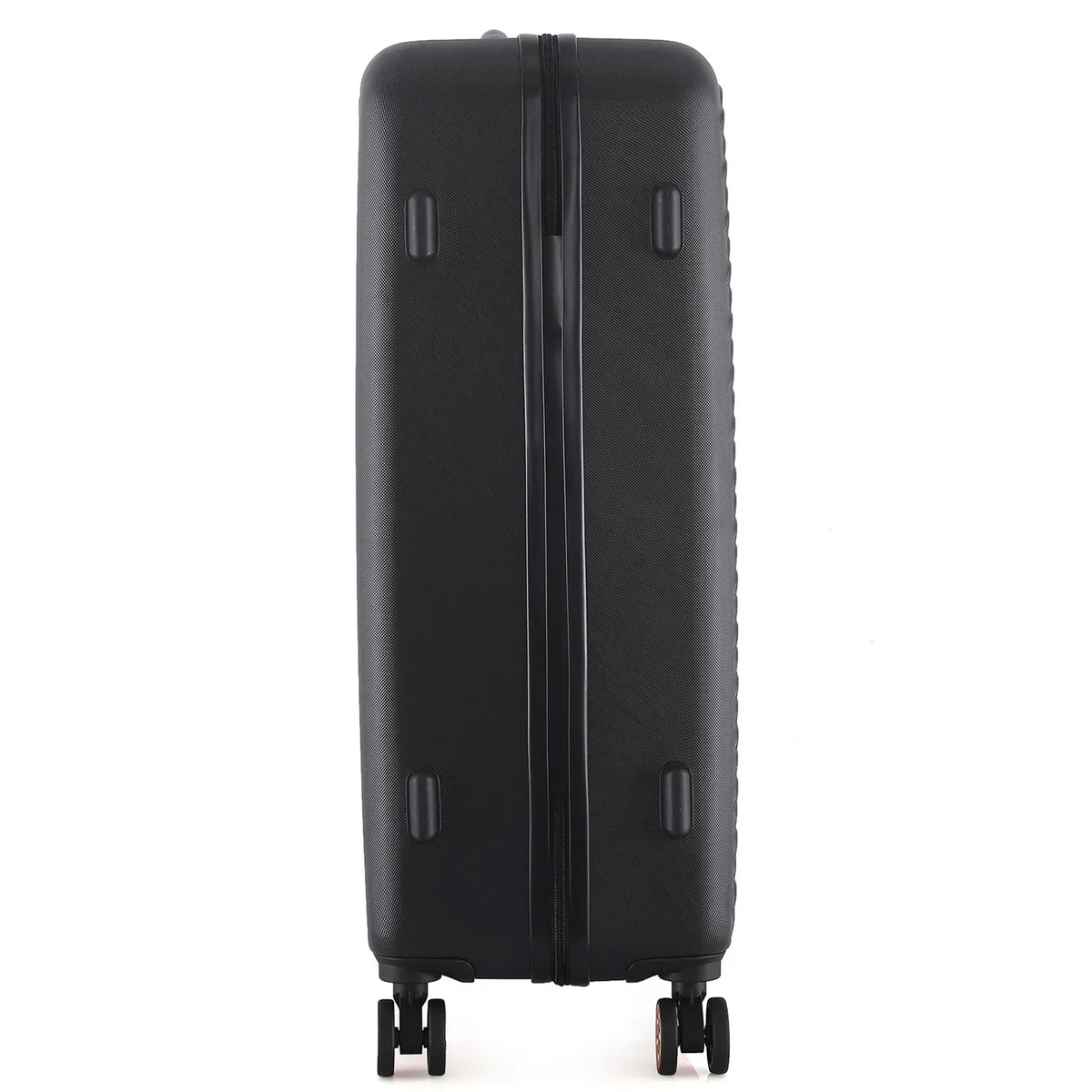 Валіза від Semi Line у чорному кольорі виглядає елегантно завдяки хвилястому візерунку фасаду та вставкам під золото. Легка телескопічна ручка з алюмінію фіксується у трьох положеннях, а ручки для перенесення виконані із пластику Soft-Touch, приємного на дотик. Втоплений кодовий замок не виступає за корпус і надійно захищає вміст. Модель поєднує стильний зовнішній вигляд і продуману функціональність.
