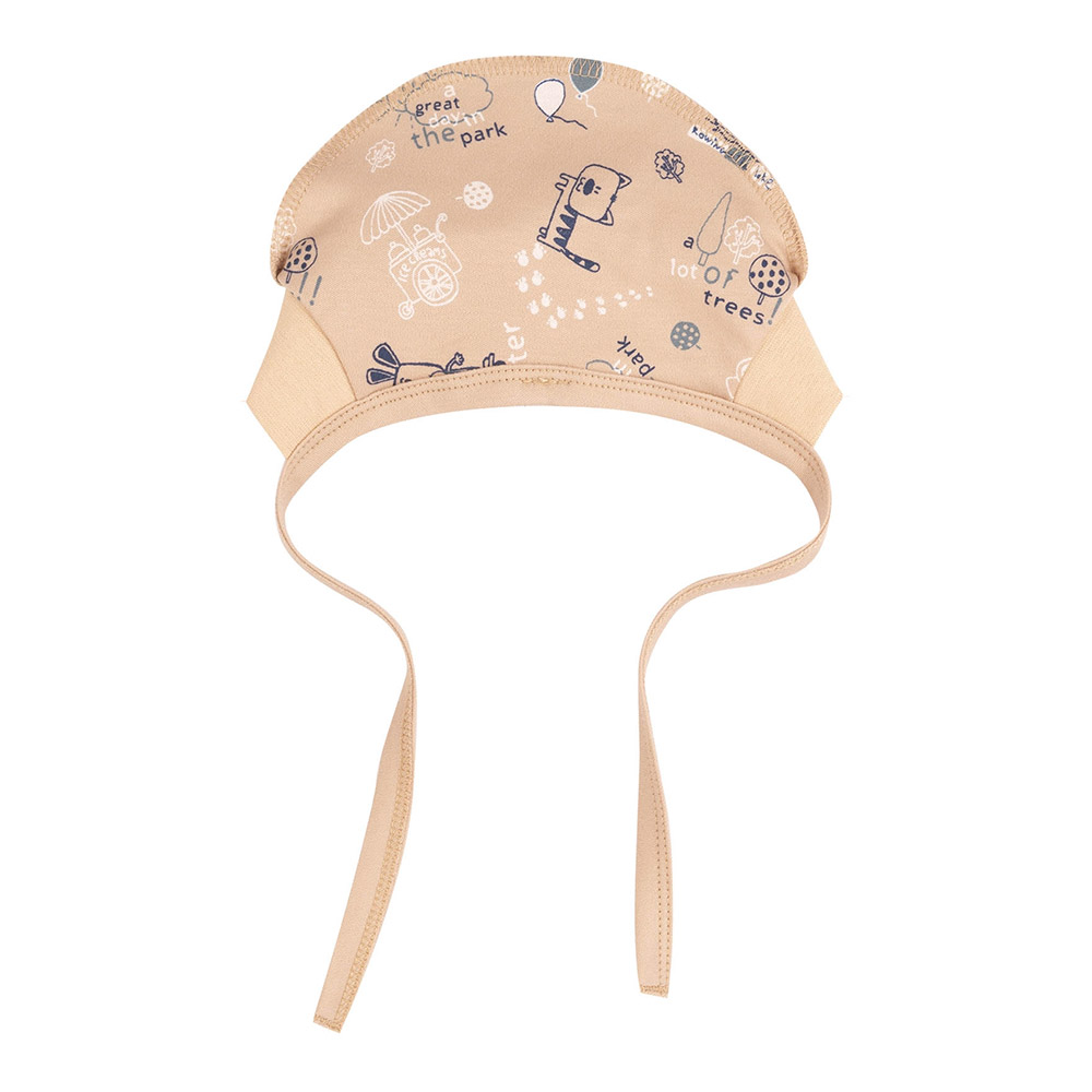 Шапочка бежевого кольору з симпатичним дитячим принтом. Модель універсальна, підійде і для хлопчика, і для дівчинки. Чепчик із зовнішніми швами, на зав'язках. Шапочка виконана з тканини інтерлок. Матеріал зі 100% натуральної бавовни, забезпечить дитині максимальний комфорт і затишок. Зовнішні шви додають ще більше комфорту і запобігають подразненню шкіри. Це особливо важливо для маленьких дітей, у яких шкіра може бути більш чутливою.
