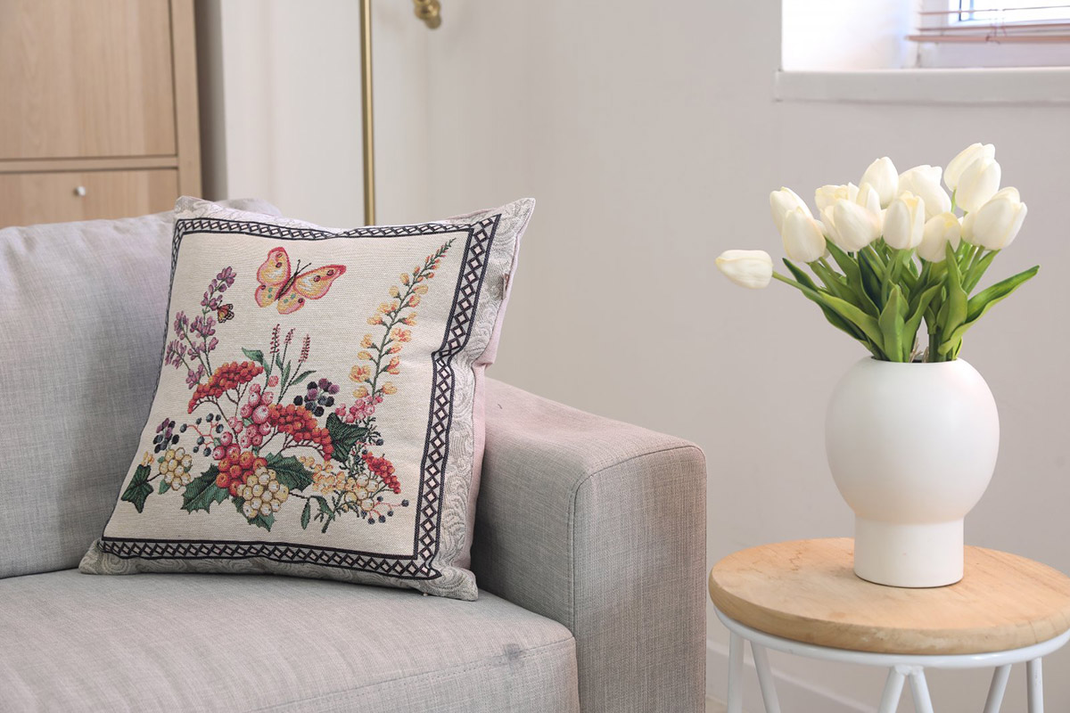 Декоративна наволочка з якісного іспанського гобелену на основі бавовни та поліестеру. Гарний малюнок з квітами та метеликом створить у кімнаті атмосферу затишку та гармонії. Наволочка оснащена зручною застібкою-блискавкою.