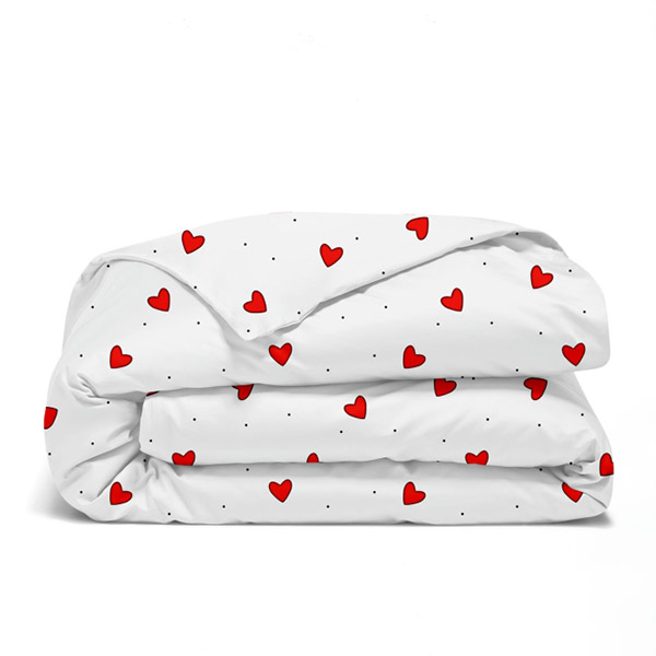 Підліткова постільна білизна з ранфорсу. Підковдра і наволочка — білого кольору з красивим малюнком з червоними сердечками. Простирадло однотонне, бежевого кольору. Матеріал з 100% органічної бавовни, м'який і приємний на дотик, забезпечить дитині комфортний сон і відпочинок.