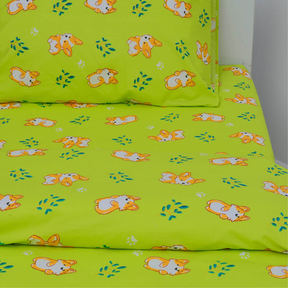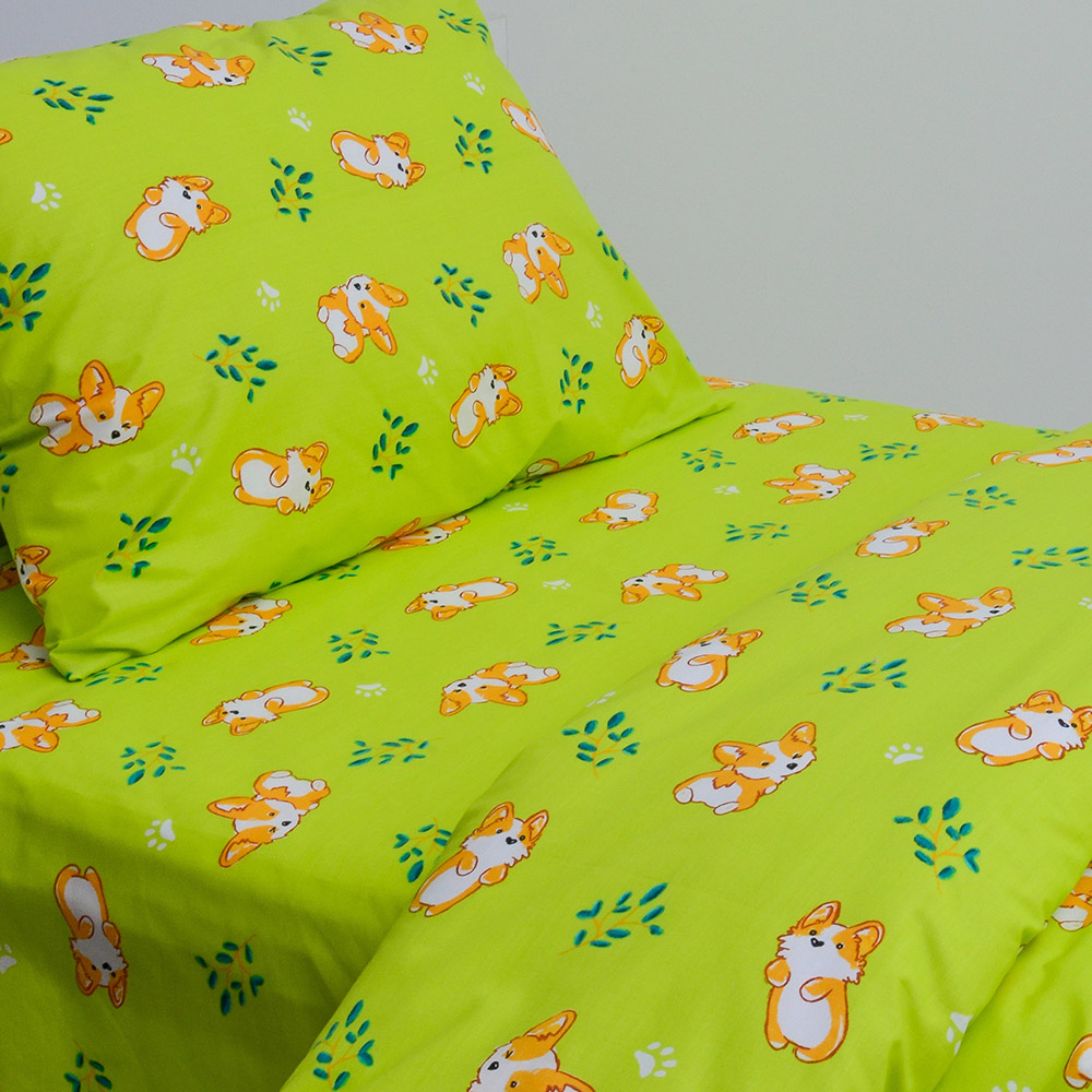 Бавовняний комплект салатового кольору з симпатичними цуценятами. Постільна білизна стане яскравим акцентом у дитячій кімнаті, подарує посмішку та гарний настрій. Натуральна бавовняна тканина забезпечить дитині комфорт і затишок під час сну.