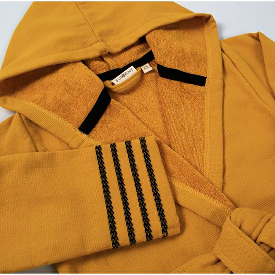 Халат оливкового кольору зі смужками на рукавах, по низу вироби і на поясі. Великий капюшон прикрашає м'який Балабон. Модель заорюється і пов'язується поясом. Халат приємний на дотик, прекрасно вбирає вологу і швидко сохне.