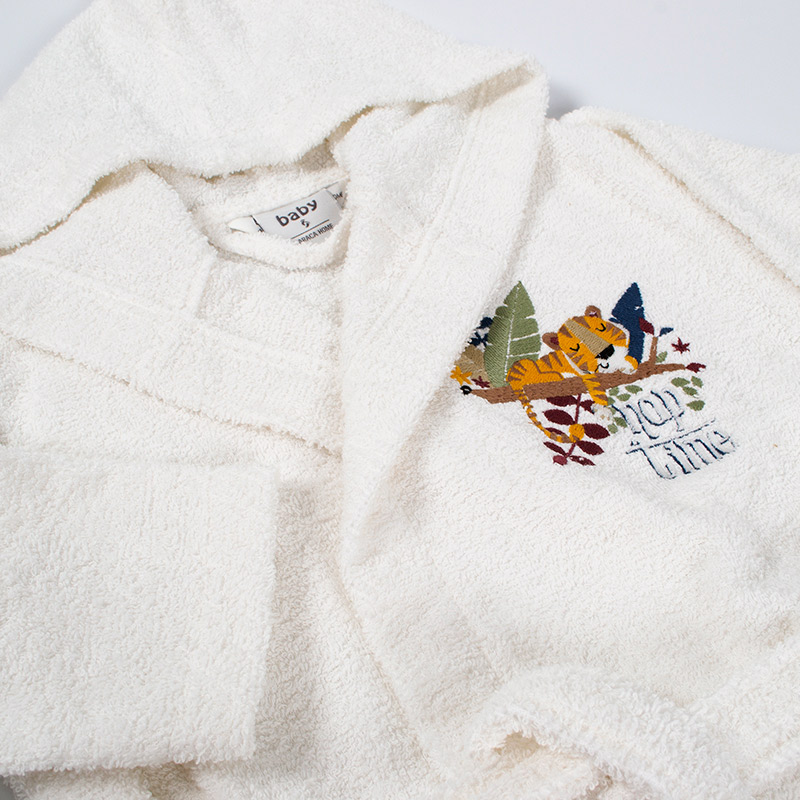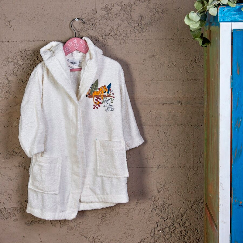 Чудовий дитячий халат Karaca Home Bummer Offwhite 2020-2 кремовий з натуральної бавовни. М'який, затишний халат дарує дитині комфорт і приємні моменти після водних процедур. Халат прикрашений вишивкою тигра на гілці, оснащений зручними кишенями і коміром. Виріб фіксується за допомогою пояса. Оптимальна довжина подолу і рукавів робить модель дуже практичною в експлуатації.