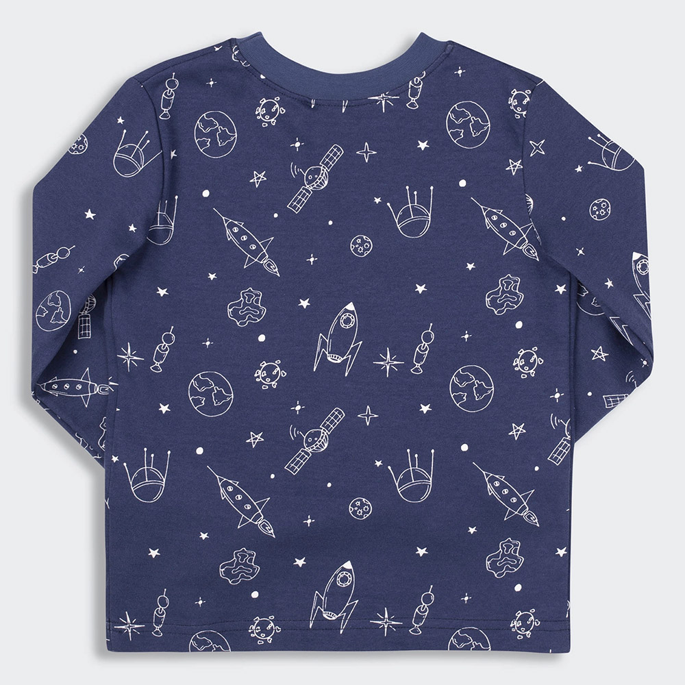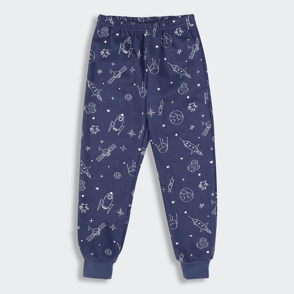 Дитяча піжама складається з лонгсліва та штанів. Модель синього кольору з симпатичним космічним принтом, підійде для хлопчика. Тканина з натуральної бавовни м'яка та приємна на дотик, забезпечує комфорт і затишок. Кофта з довгими рукавами з манжетами. Штани зі зручною гумкою на поясі та манжетами знизу.