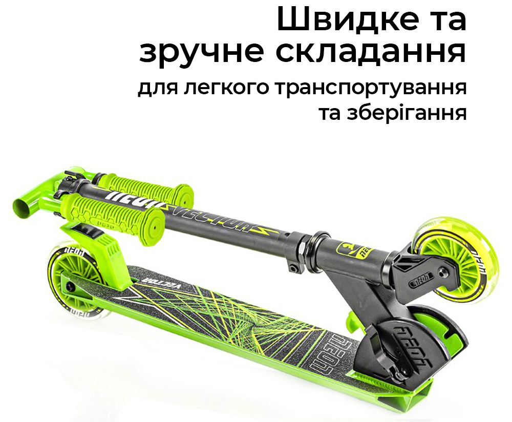 Самокат Vector Neon NT05G2 зелений. Легка рама і комфортне керування роблять Neon Vector відмінним варіантом для першого 2-Вух колісного самоката. Беріть його на прогулянки і висвітліть околиці яскравим підсвічуванням коліс. Neon Vector - це витончений і легкий самокат. Чи не великі колеса і задній гальмо роблять цей самокат одним з найбільш маневрений в своєму класі і максимально універсальним для повсякденного використання. Широкий діапазон регулювань керма і не велику вагу підійдуть для дітей від 5 років і до 9 років.
