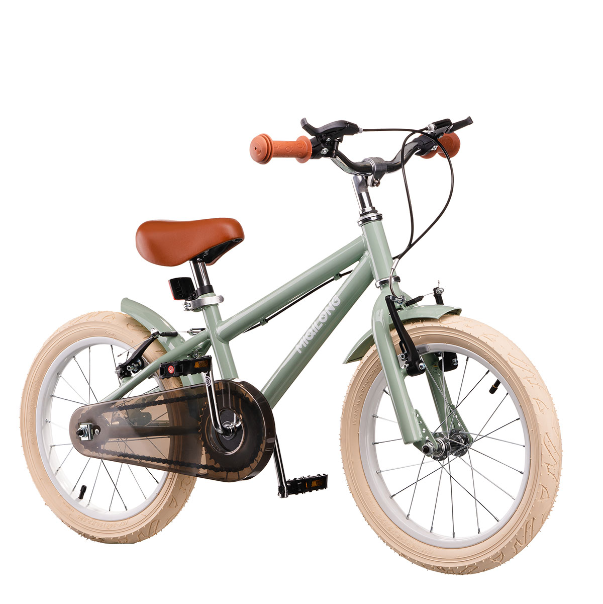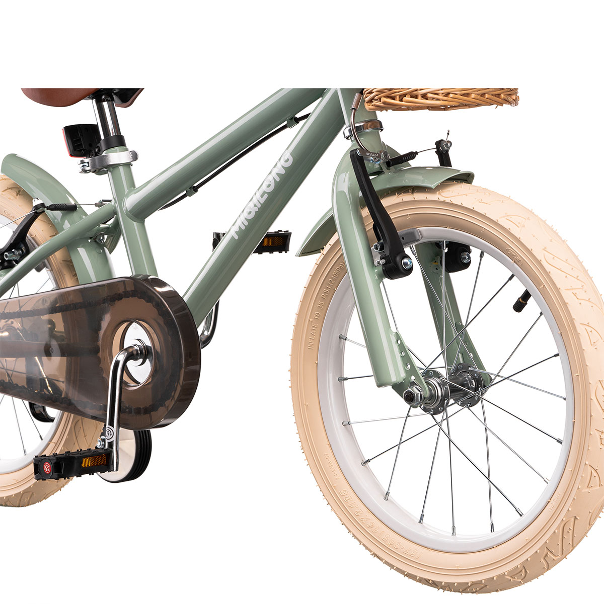 Дитячий велосипед Miqilong RM 16 ATW-RM16-OLIVE оливковий. Рама велосипеда виконана з металу і має необхідний запас міцності, щоб витримати всі тяготи навчання дитини катання на велосипеді. Рама виконана за класичною високою схемою міського велосипеда з високим кермом. Це забезпечує зручну посадку і дозволяє дитині їздити на велосипеді з рівною поставою, що не горблячись. У комплектацію велосипеда входить 2 катафоти, дзвіночок на кермо, набір інструментів для збірки та обслуговування велосипеда, корзинка з натурального ротанга, набір бічних навчальних коліс.