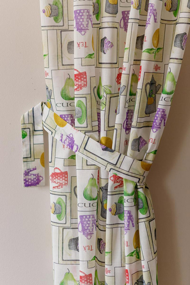 Комплект гардин із напівпрозорого матеріалу. Гарний принт із фруктами, солодощами та чайничками чудово доповнить інтер'єр кухні, а якісна тканина надовго збереже привабливий зовнішній вигляд. Гардини доповнені підхватами-підв'язками.
