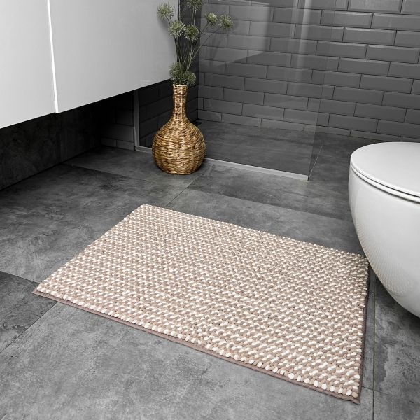 Килимок для ванної Махрамат Мелоді DarianA бежевого кольору розміром 55х80 см — це поєднання м’якості, зручності та естетики. Ворс висотою 20 мм з 100% поліестеру приємний на дотик та швидко сохне. Основа з розпиленого латексу запобігає ковзанню на вологій підлозі. Акуратна обробка бейкою в тон додає виробу завершеного вигляду й підвищує його зносостійкість. Важко уявити санвузол без м'якого, теплого килимка. Він забезпечує затишок та комфорт у цьому приміщенні. Так, килимки для ванної кімнати DarianA з товстим ворсом підвищать якість життя свого власника. Оскільки килимки у ванній не тільки захищають ноги від холодної підлоги, а й убирають вологу, бризки з душу чи раковини.
