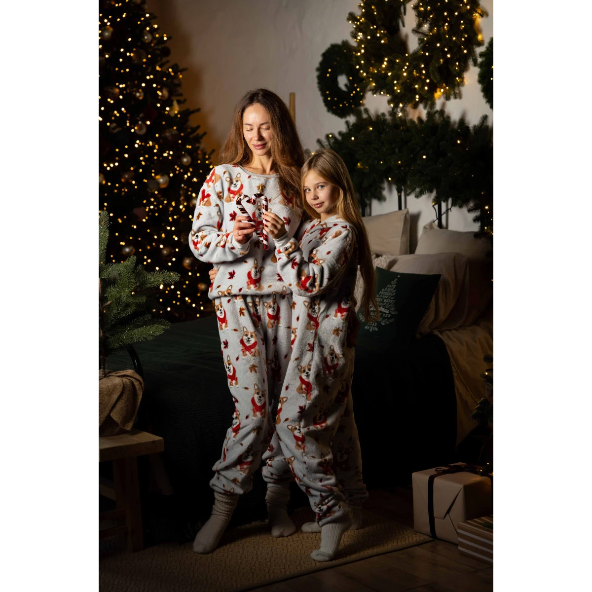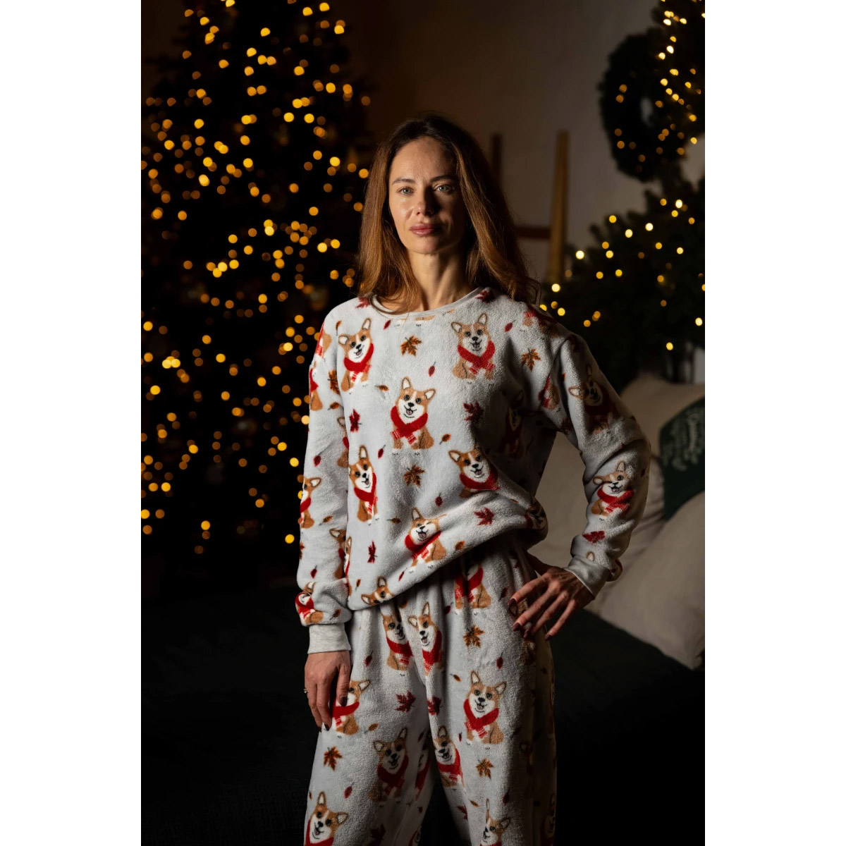 Домашній жіночий костюм German Volf виконаний з м'якого і теплого велсофта з милим принтом корги. У комплект входять світшот вільного крою та штани на гумці з манжетами. Червоні манжети та комір додають яскраві акценти образу. Матеріал приємний до тіла, добре зберігає форму, не викликає подразнення та простий у догляді. Сірий фон із зображенням корги в шарфиках та осіннім листям створює затишну атмосферу для домашнього відпочинку та прохолодних вечорів.