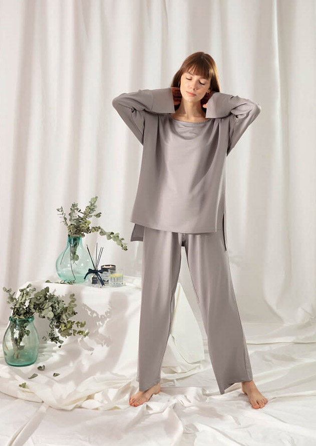 Однотонний костюм сірого кольору для максимально комфортного та приємного відпочинку у затишній обстановці. У наборі — кофта з круглим широким вирізом, бічними розрізами та розрізами на манжетах, а також зручні штани з гумкою на талії. Вироби вільного крою, легкі та приємні на дотик, виконані з якісної шовковистої тканини на основі віскози. Комплект чудово доповнить домашній гардероб, створить стильний образ.