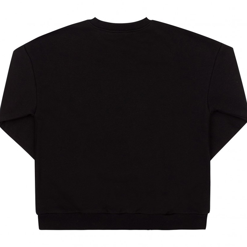 Трикотажний джемпер чорного кольору, спереду мінімалістичний стильний принт-напис. Модель універсальна, підійде і для хлопчика, і для дівчинки. Джемпер виконаний з тканини трикотаж-тринитка. Матеріал приємний і комфортний, практичний, ідеально підійде на прохолодну пору року. Горловина, манжети і низ джемпера виконані з качкорси.