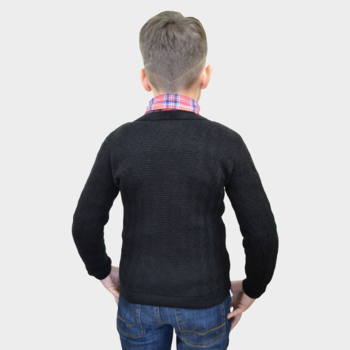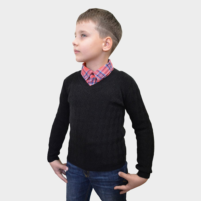 Джемпер для хлопчика Прованс Геометрія чорний однотонної якісної в'язки стане прекрасним елементом гардероба. Гострий V-подібний виріз чудово підходить для коміра сорочки. Стане улюбленим предметом гардероба для свята та на щодень.