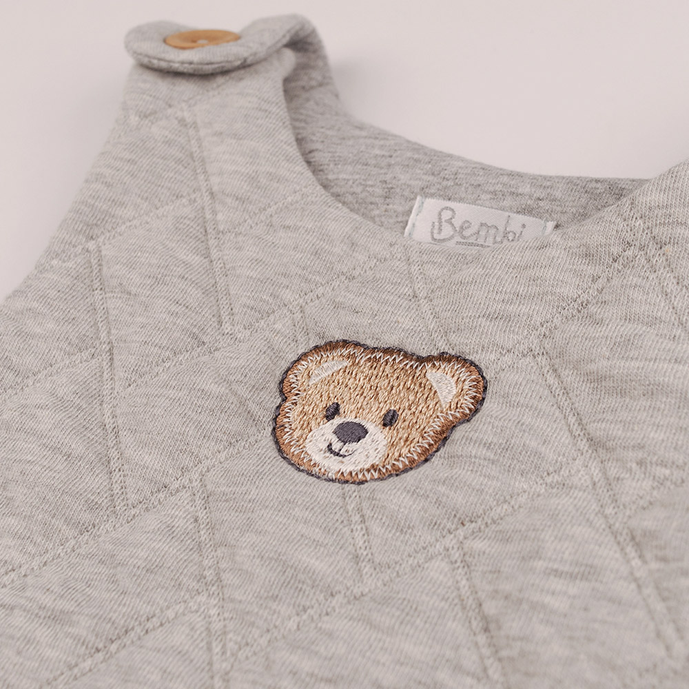Напівкомбінезон сірого кольору. Спереду - симпатична вишивка та 2 накладні кишеньки. Модель універсальна, підійде і для хлопчика, і для дівчинки. Напівкомбінезон застібається на кнопки між ніжками і на ґудзики на плечах. Напівкомбінезон виконаний зі стьобаної тканини капітоне. Матеріал з бавовни і поліестеру щільний, м'який і приємний на дотик, ідеально підходить для ніжної дитячої шкіри.