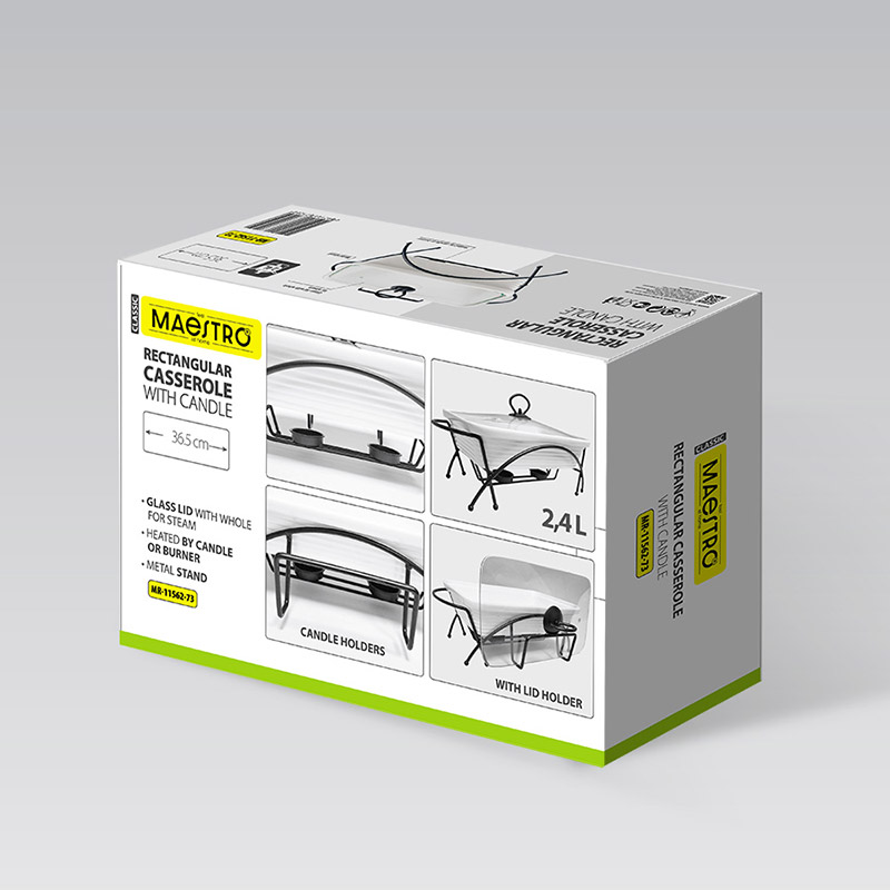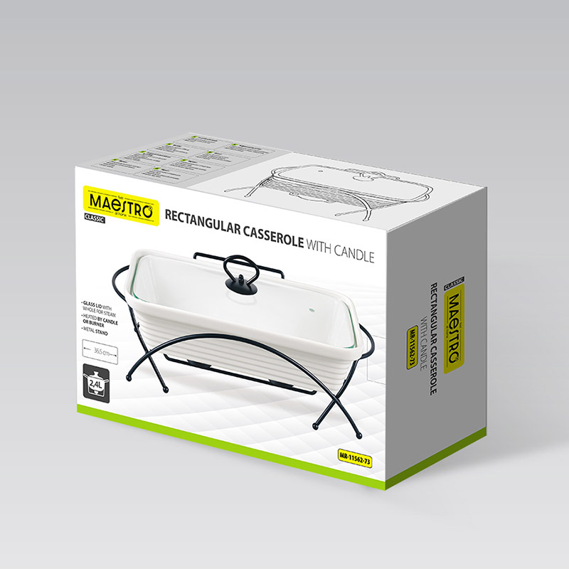 Прямокутний марміт білого кольору об'ємом 2.4 л. Марміт зі скляною кришкою і металевою підставкою. Марміт виконаний з екологічно чистих матеріалів у сучасному дизайні. Підставка служить для утримання керамічної форми і для підігріву їжі (підігрів від свічки або пальника). У комплекті передбачена скляна кришка з отвором для виходу пари.