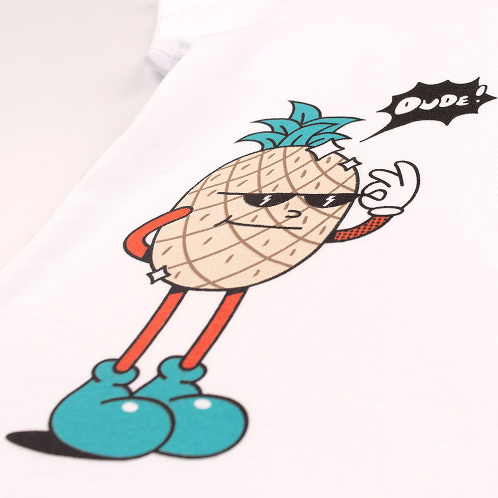 Футболка білого кольору, спереду - симпатичний принт. Модель підійде для хлопчика. Футболка прямого крою, з круглою горловиною та з короткими рукавами. Футболка виконана з тканини супрем. Натуральний бавовняний матеріал легкий, м'який і приємний на дотик, добре пропускає повітря, ідеально підходить для дитячої шкіри.