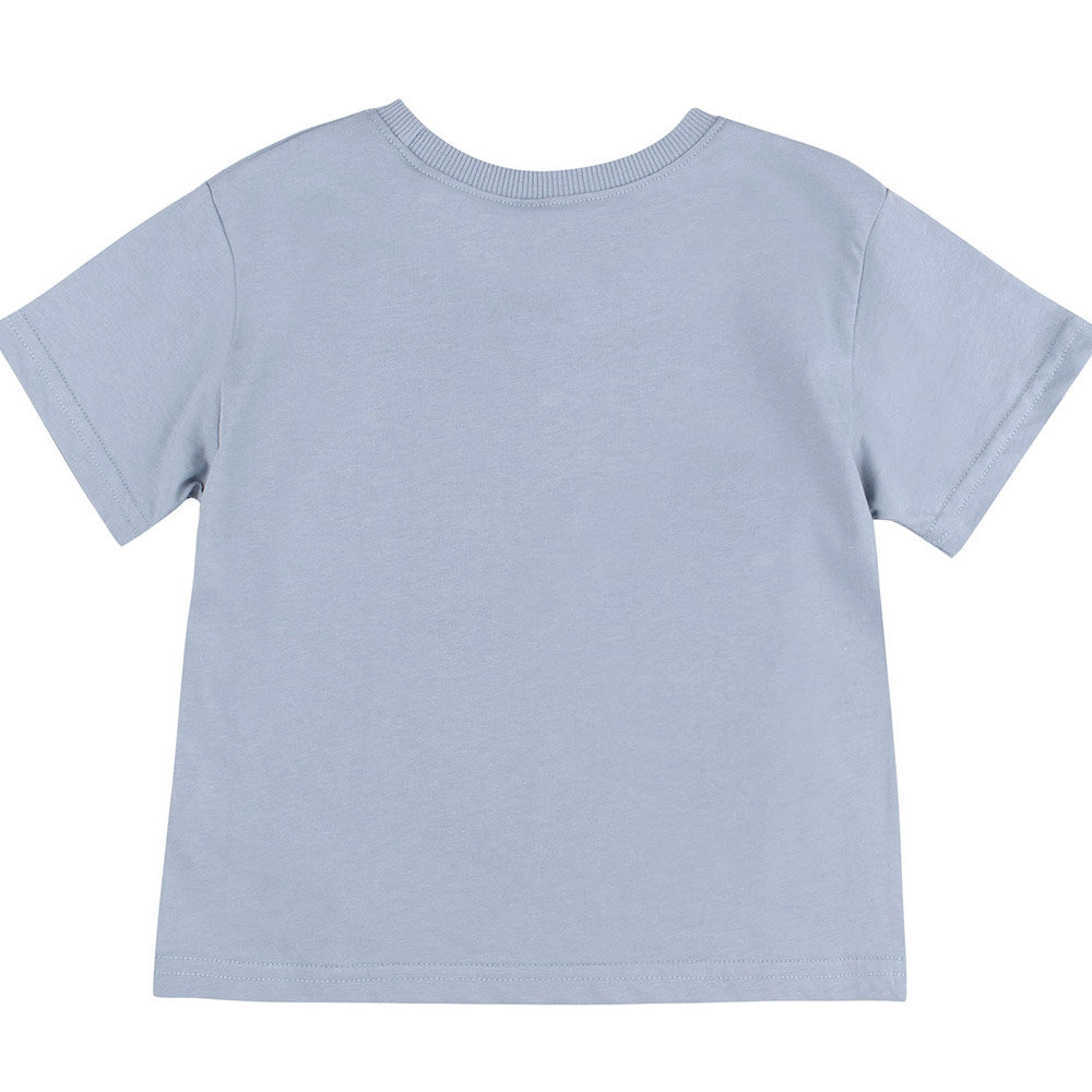 Футболка сіро-блакитного кольору, спереду - стильний абстрактний принт. Модель підійде для хлопчика. Футболка прямого крою, з круглою горловиною і з короткими рукавами. Футболка виконана з тканини супрем. Натуральний бавовняний матеріал легкий, м'який і приємний на дотик, добре пропускає повітря, ідеально підходить для дитячої шкіри.