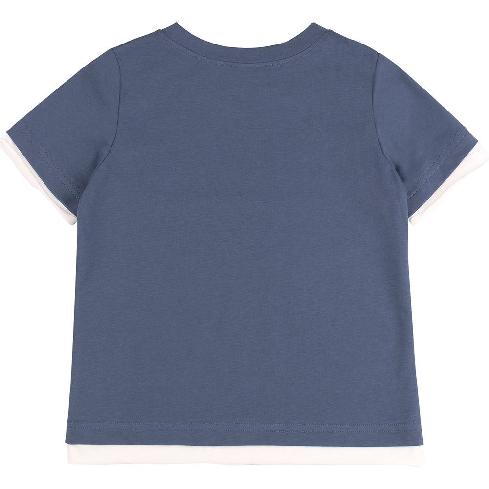 Футболка синього кольору з імітацією подвійного низу, спереду мінімалістичний принт-напис. Модель підійде для хлопчика. Футболка прямого крою, з круглою горловиною та з короткими рукавами. Футболка виконана з тканини супрем. Натуральний бавовняний матеріал легкий, м'який і приємний на дотик, добре пропускає повітря, ідеально підходить для дитячої шкіри.