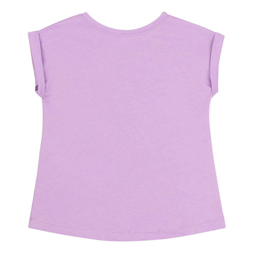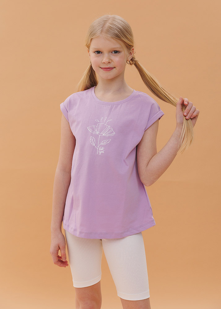 Дитяча футболка бузкового кольору, спереду гарний ніжний принт з квіткою. Модель підійде для дівчинки. Футболка виконана з тканини супрем. Бавовняний матеріал легкий, м'який і приємний на дотик, добре пропускає повітря, ідеально підходить для дитячої шкіри.