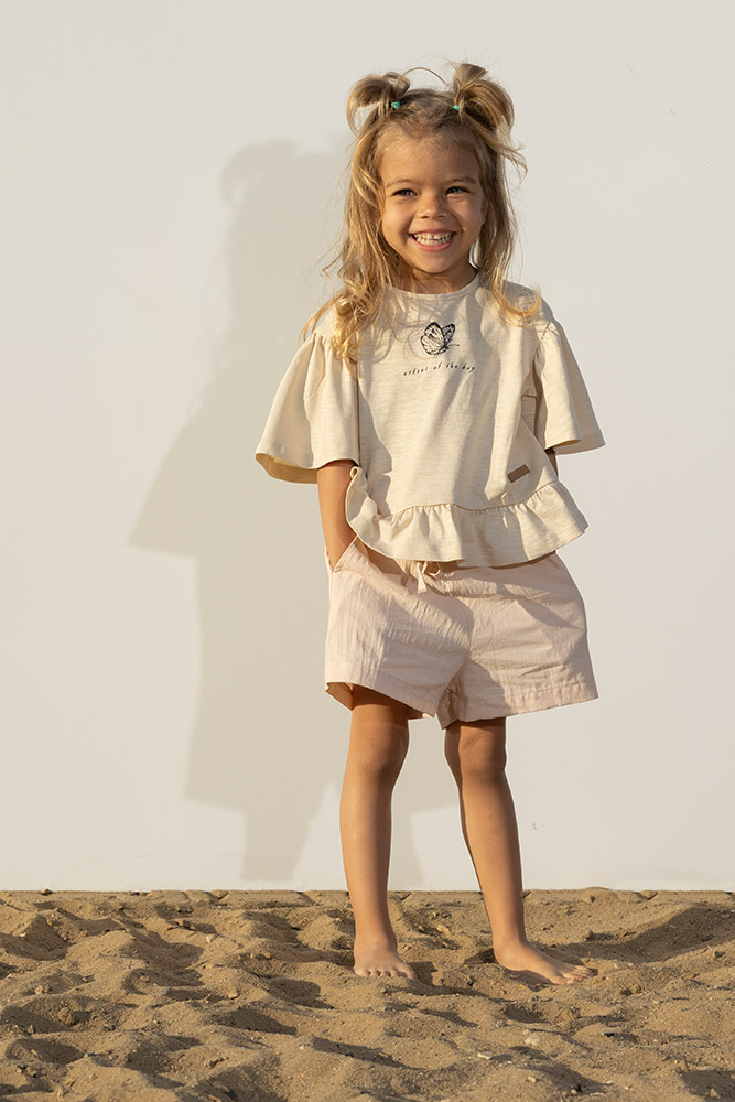Футболка молочного кольору, спереду красивий принт із метеликом і написами. Модель підійде для дівчинки. Футболка прямого крою, з короткими рукавами-воланами і з круглою горловиною, по низу виробу - рюша, ззаду на спинці - застібка на ґудзик. Футболка виконана з тканини супрем. Бавовняний матеріал легкий, м'який і приємний на дотик, добре пропускає повітря, ідеально підходить для дитячої шкіри.