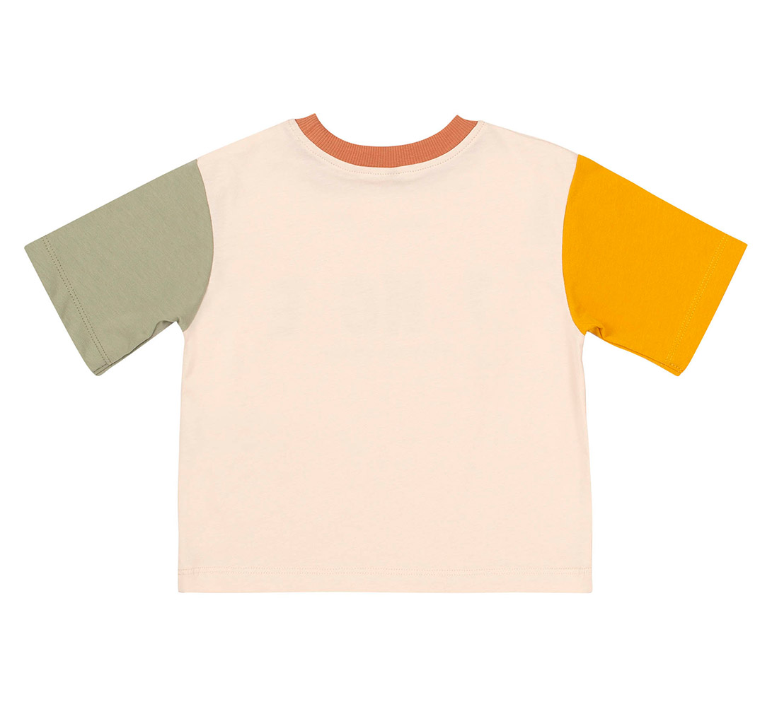 Футболка молочного кольору з принтом-написом спереду та з різнокольоровими рукавами. Модель підійде для хлопчика. Футболка прямого крою, з круглою горловиною та з короткими рукавами. Футболка виконана з тканини супрем. Бавовняний матеріал легкий, м'який і приємний на дотик, добре пропускає повітря, ідеально підходить для ніжної дитячої шкіри.
