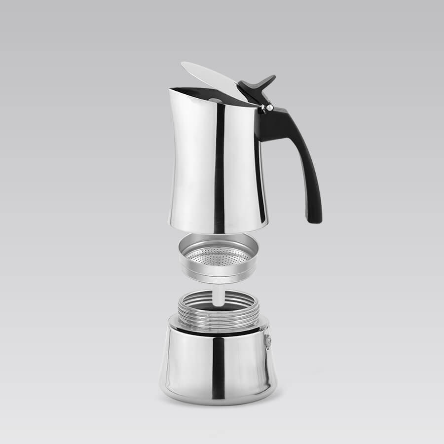 Кавоварка гейзерна об'ємом 100 мл (для приготування 2 чашки кави). Модель виготовлена з високоякісної нержавіючої сталі. Кавоварка стане незамінною помічницею для приготування улюбленого напою. Кавоварка складається із двох ємностей, розділених спеціальним фільтром. Підходить для всіх джерел тепла.