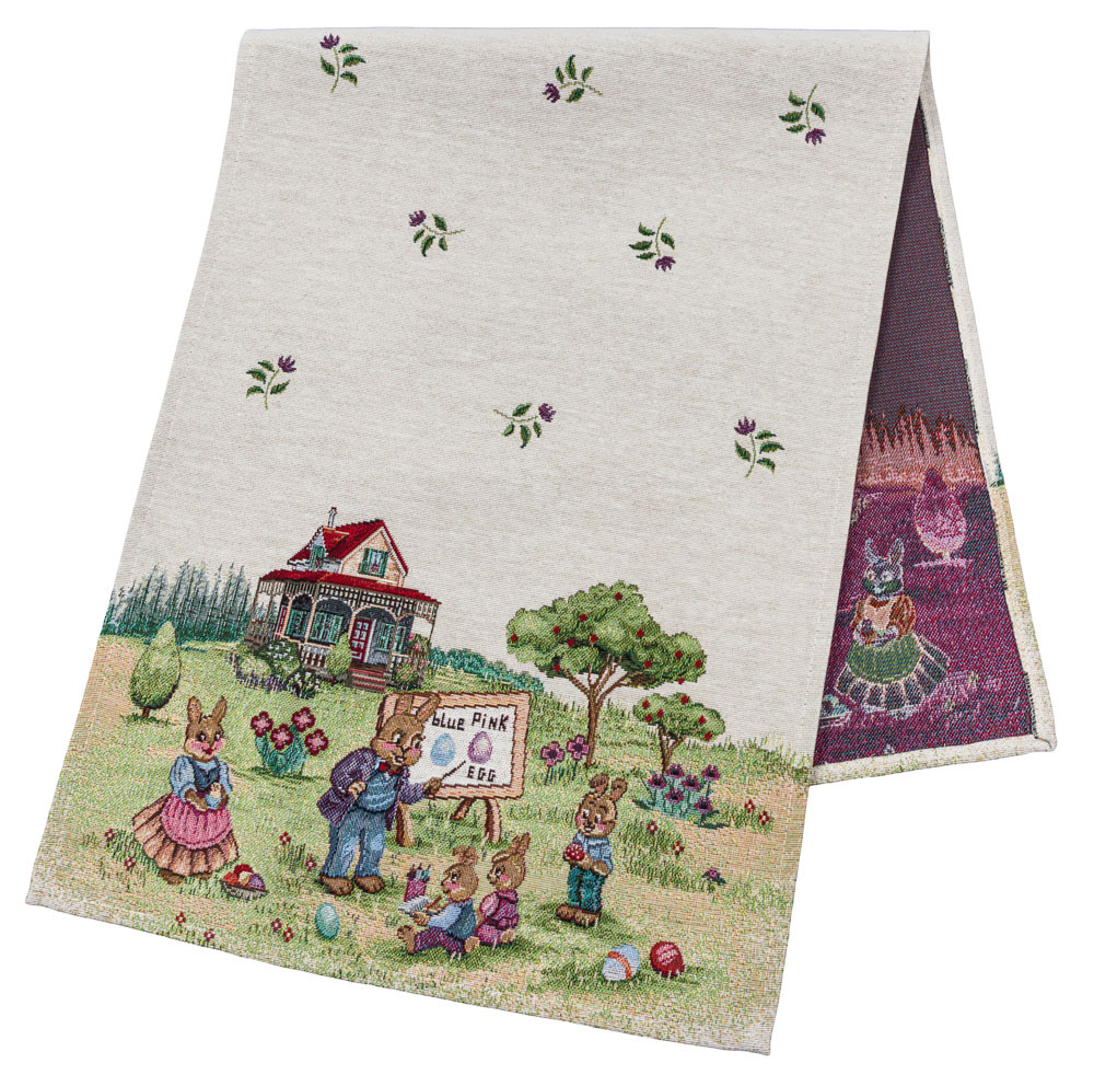 Святкова доріжка із якісного іспанського гобелену. Малюнок із кумедним кролячим сімейством подарує посмішку та гарний настрій, прикрасить інтер'єр до Великодня. Міцна тканина прослужить вам довгий час, зберігши початковий колір та вигляд.