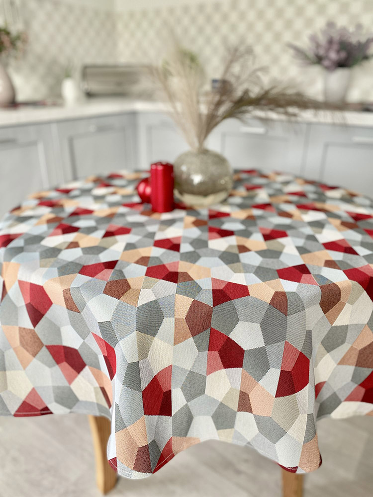 Кругла гобеленова скатертина з різнокольоровим мозаїчним візерунком. Геометричний малюнок стане стильним та красивим акцентом в інтер'єрі. Скатертина виконана з високоякісного щільного гобелену, прослужить вам довгий час, зберігши привабливий зовнішній вигляд та первинний колір.