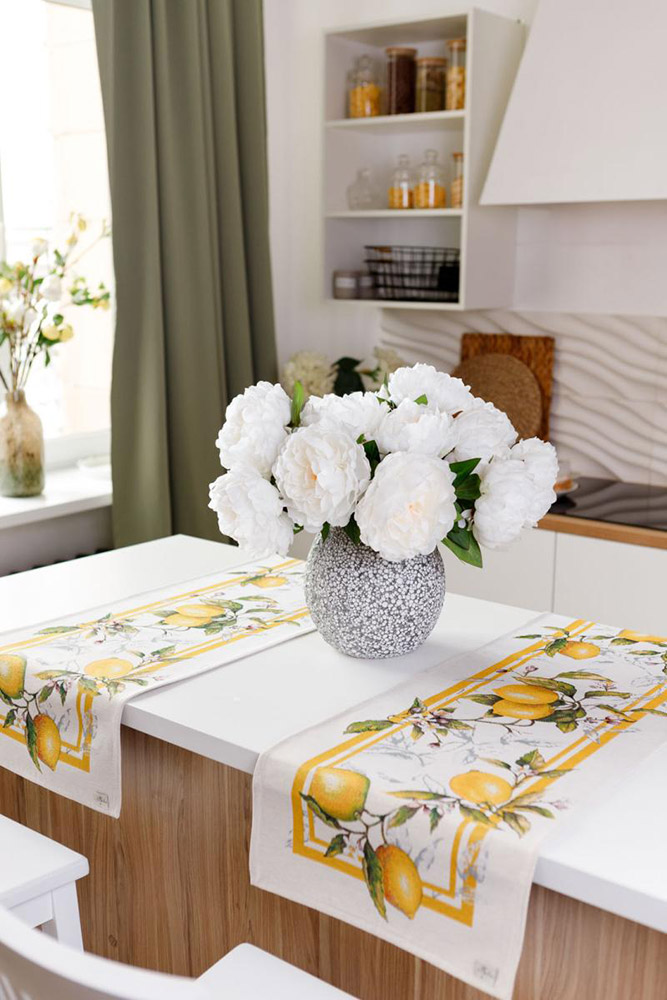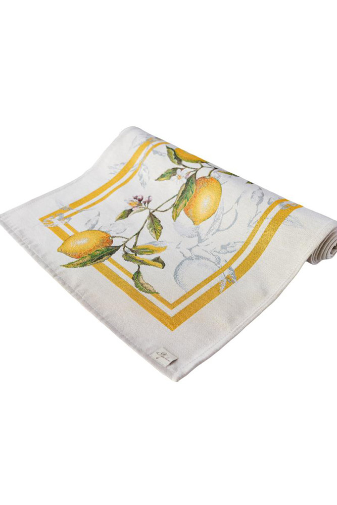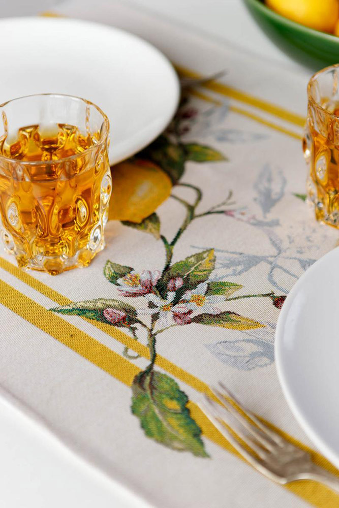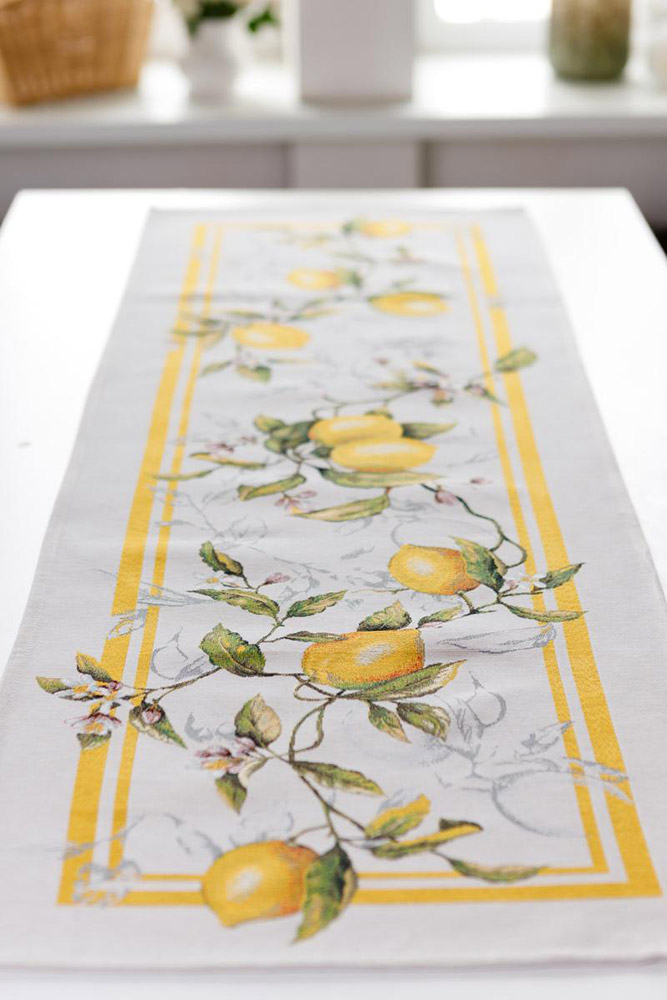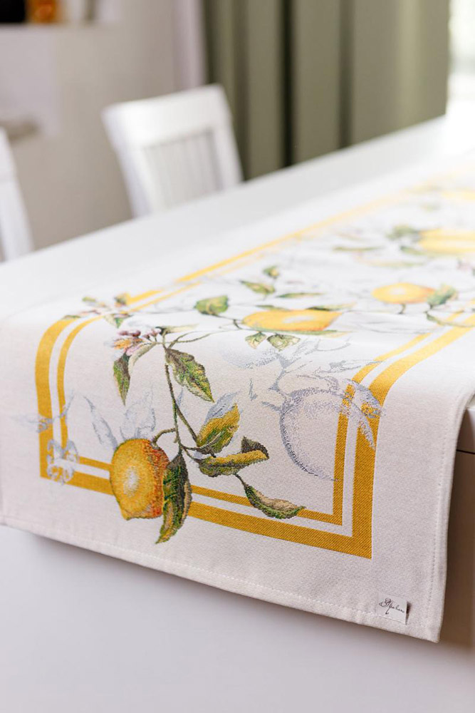 Доріжка з красивим принтом з лимонами і квітами. Малюнок у середземноморському стилі створить в інтер'єрі неповторну атмосферу релаксу, гармонії та затишку. Доріжка чудово доповнить сервірування столу, зробить кожен обід або вечерю особливим, прекрасно підійде для особливих заходів і свят. Доріжка виконана з якісного іспанського гобелена на основі бавовни та поліестеру. Тканина щільна, міцна та зносостійка, прослужить вам тривалий час, зберігши первісний колір і вигляд.