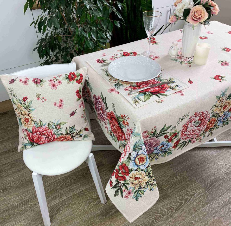 Чудова скатертину з якісного щільного іспанського гобелена на основі бавовни і поліестеру. Квітковий малюнок прикрасить святковий стіл, наповнить інтер'єр атмосферою гармонії і затишку.