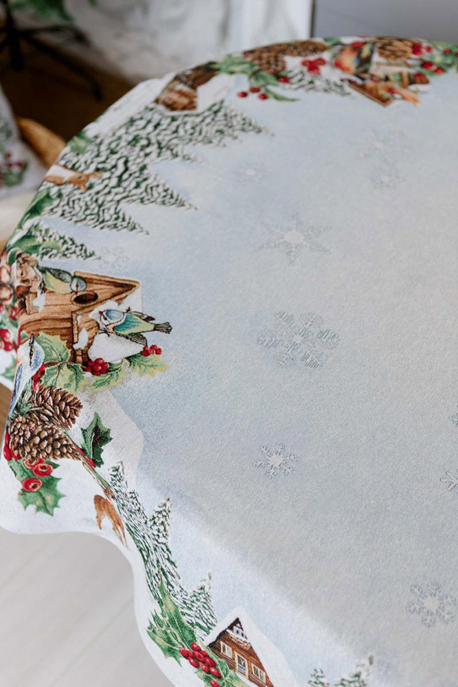 Чудова овальна скатертина з якісного щільного гобелена на основі бавовни та поліестеру з мерехтливими нитками люрексу. Зимовий малюнок стане родзинкою інтер'єру, наповнить оселю атмосферою позитиву і затишку, подарує святковий настрій, відчуття гармонії та казки.