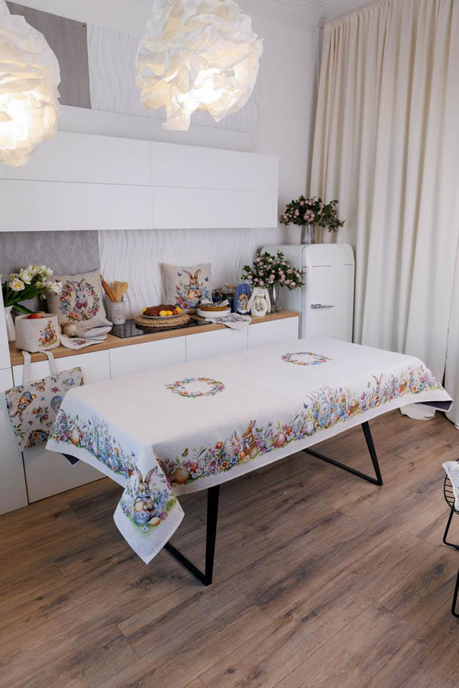 Скатертина з красивим святковим великоднім малюнком. Скатертина створить в інтер'єрі неповторну атмосферу весни, гармонії та затишку, чудово доповнить сервірування столу до Великодня. Скатертину виготовлено з якісного іспанського гобелена на основі бавовни й поліестеру. Тканина цупка, міцна та зносостійка, прослужить вам тривалий час, зберігши первісний колір і вигляд.