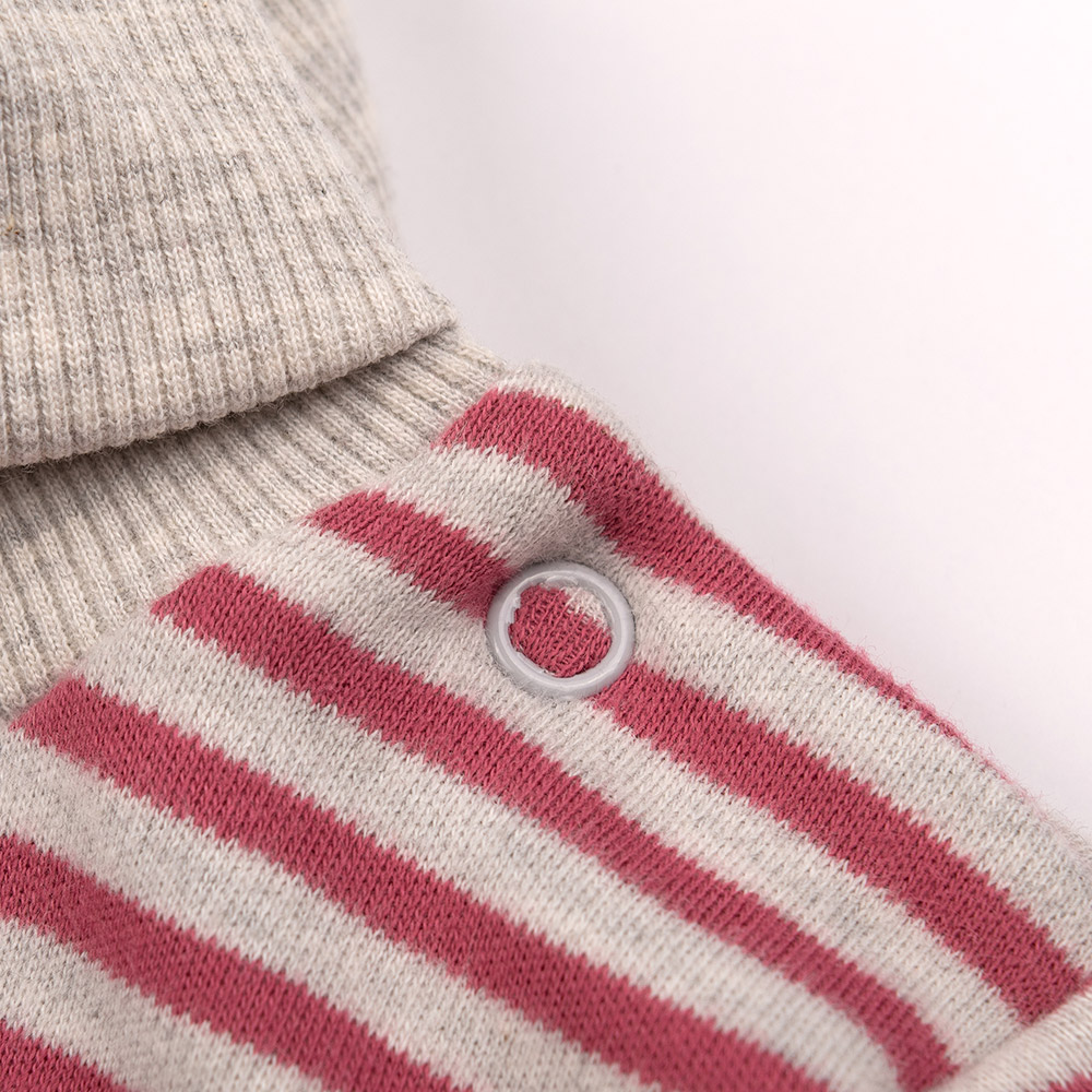 Гольф у сіро-рожевому кольорі з симпатичним принтом у смужку. Модель підійде для дівчинки. Гольф із довгими рукавами на манжетах, а також із коміром-стійкою з відворотом. Гольф виконаний із тканини шардон-інтерлок. Матеріал з легким начосом, утеплений, приємний і комфортний, практичний, ідеально підійде на прохолодну пору року.