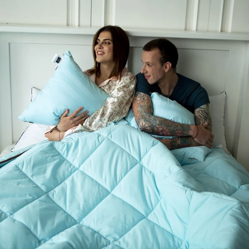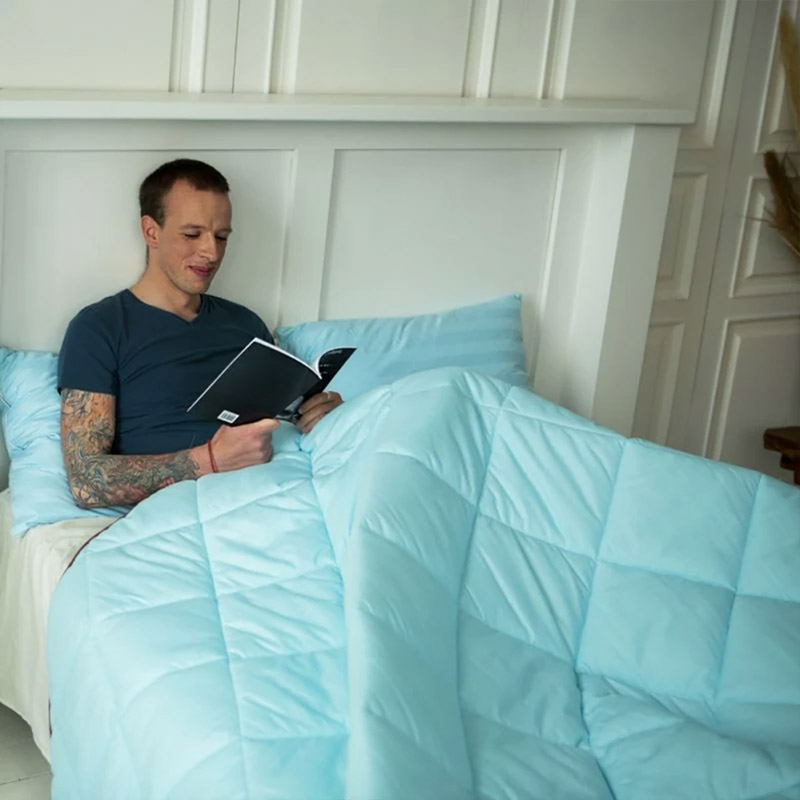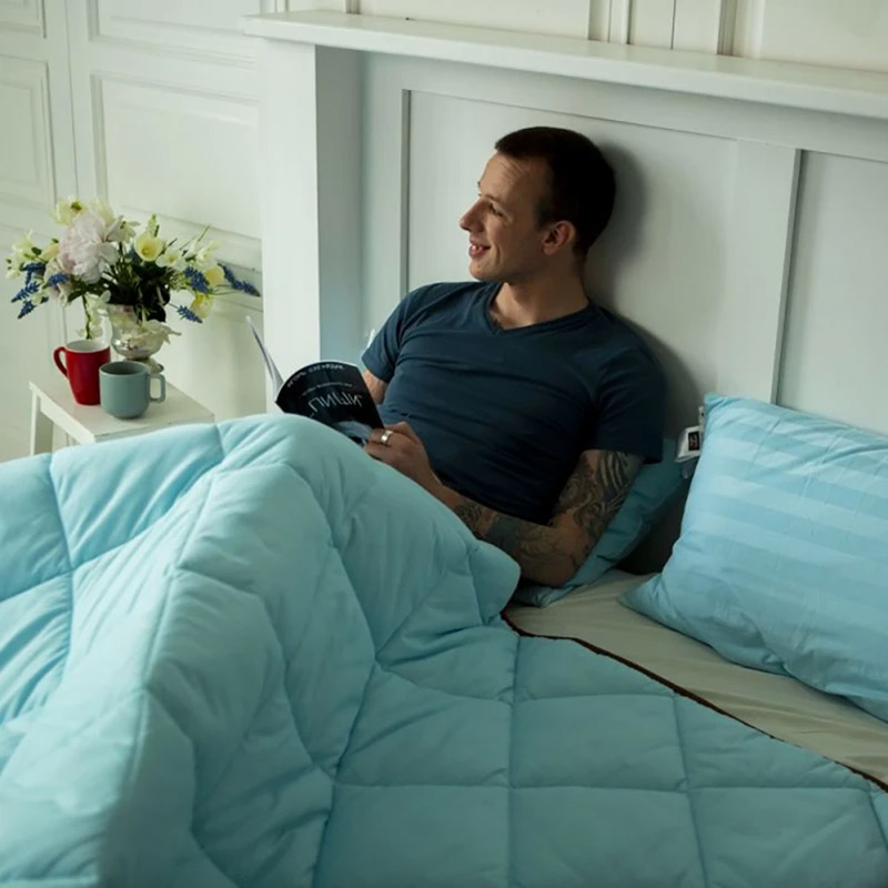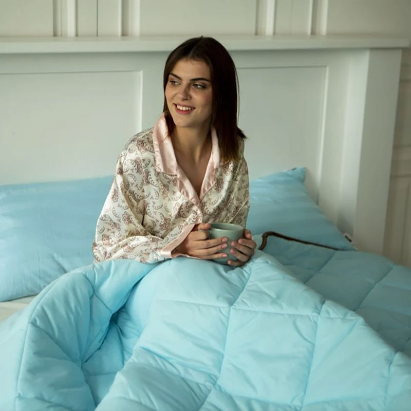 Легка і тонка ковдра для комфортного сну влітку. Ковдра з наповнювачем із натуральної бавовни та поліефірного волокна. Бавовняний наповнювач добре поглинає вологу, не парить, не викликає алергії. Наповнювач рівномірно розподілений і простьобаний по всій ковдрі. Чохол ковдри виконаний з натуральної бавовняної тканини блакитного кольору. Матеріал м'який і приємний на дотик, прекрасно пропускає повітря.