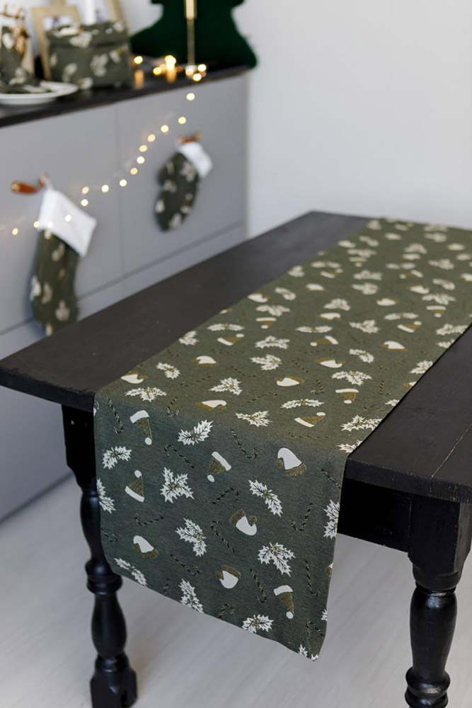 Доріжка зеленого кольору із симпатичним святковим малюнком. Доріжка чудово доповнить сервірування столу під час Нового року або Різдва, подарує святковий настрій, відчуття затишку і гармонії. Якісна іспанська жакардова тканина з бавовни і поліестеру прослужить вам довгий час, зберігши привабливий зовнішній вигляд.
